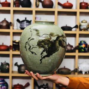 Chiếc bình Somayaki xanh ngọc vẽ ngựa vs thông điệp một năm mới ngựa phi nước đại