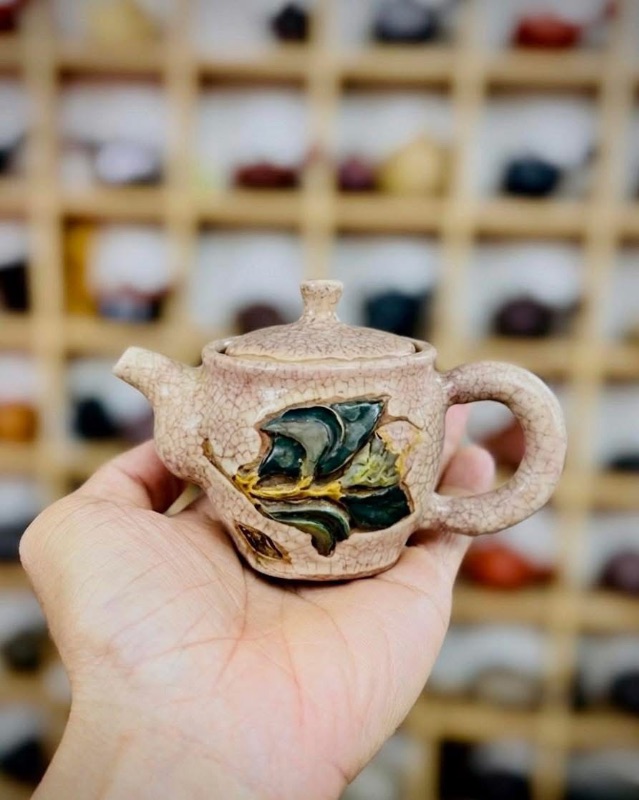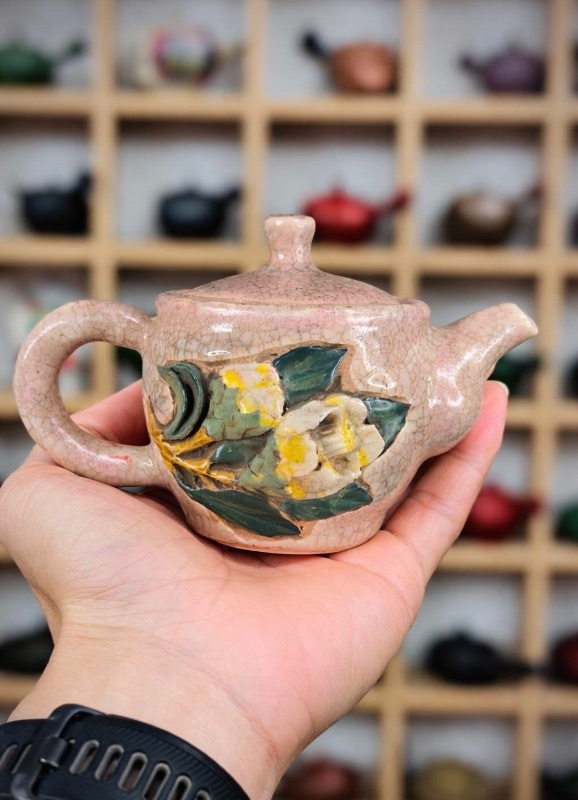 – Ấm cổ, chế tác và tạo hình thủ công, hoa bạch trà đắp nổi 2 mặt