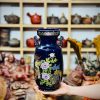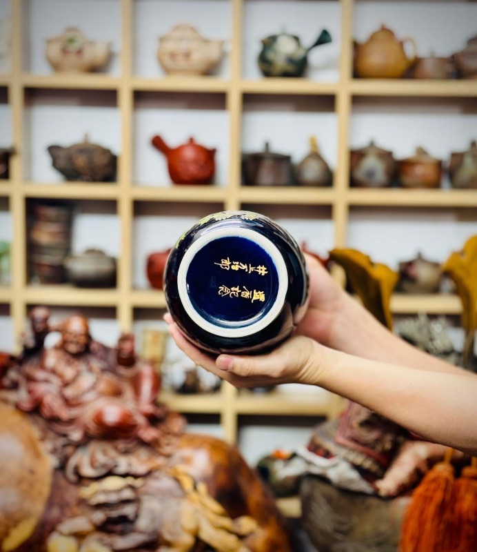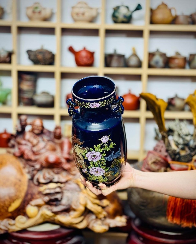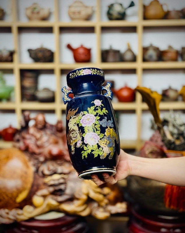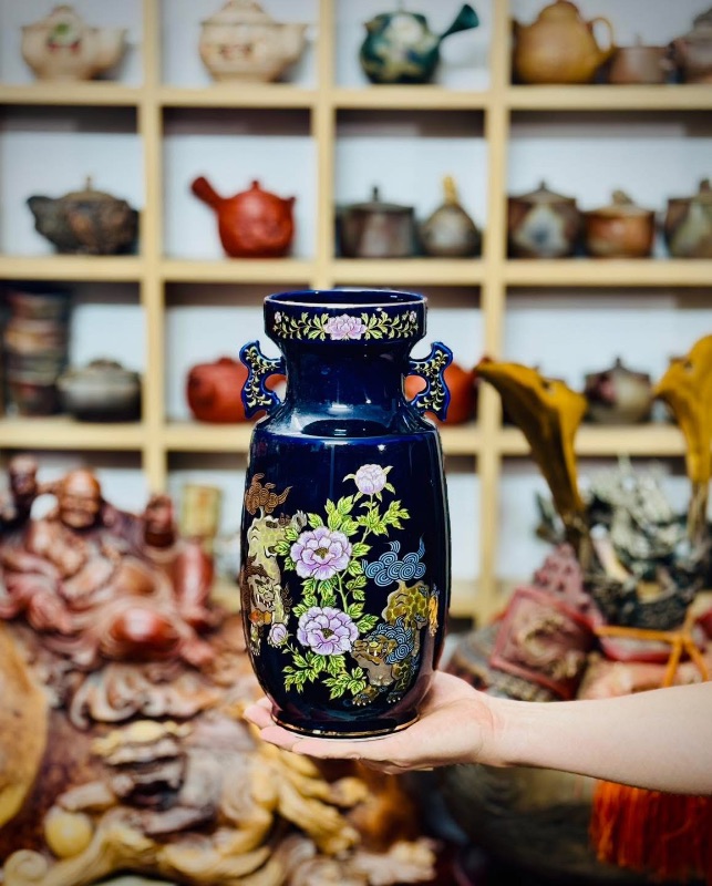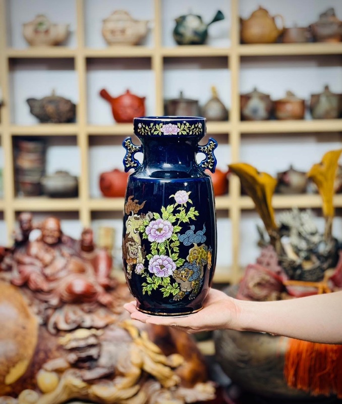 Bình Kutani vẽ Song Lân Đáo Mẫu Đơn vẽ tay vẽ vàng trên nền xanh cobalt rất đẹp và sang mời các bác ngắm và sưu tầm
