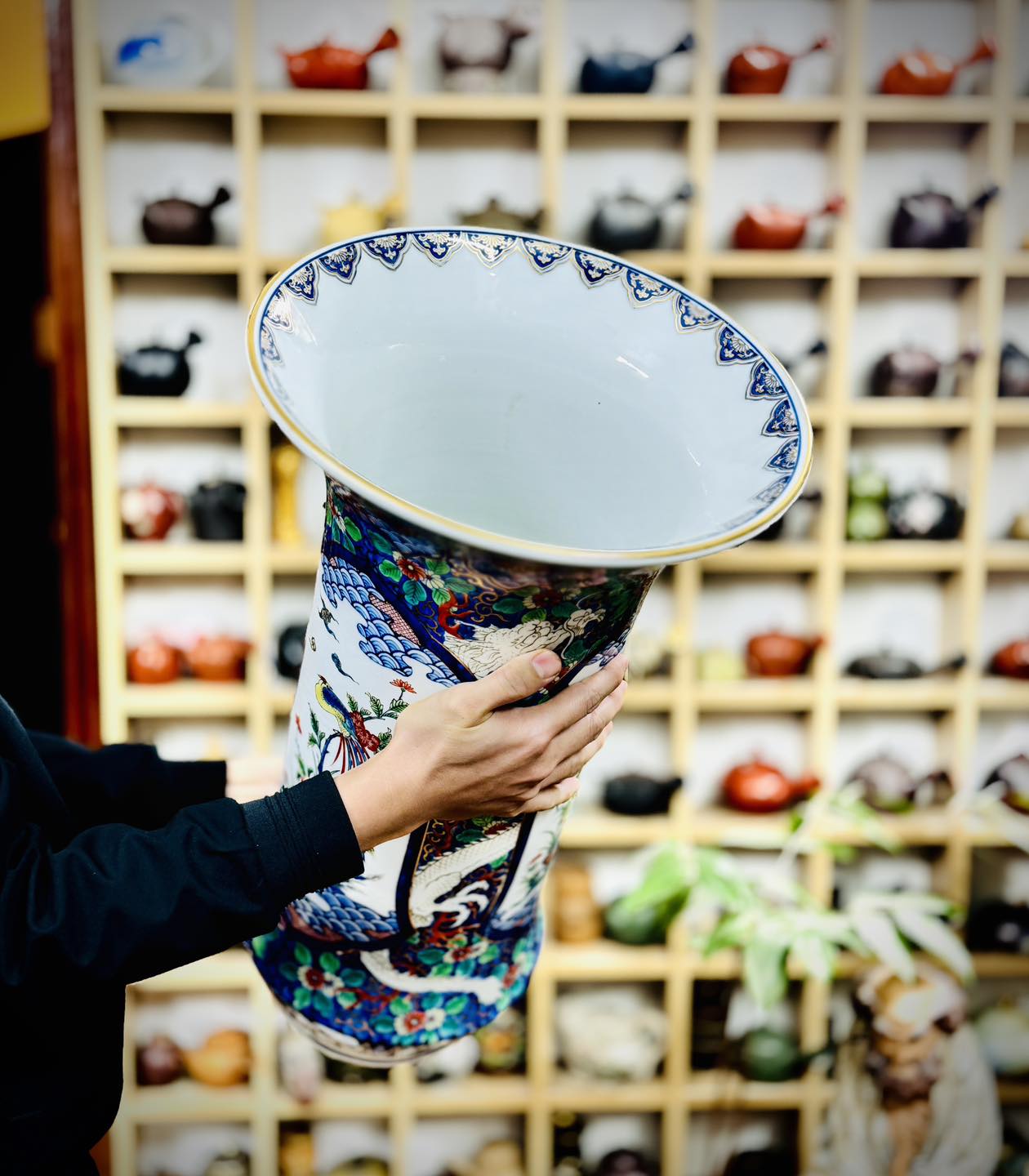 – Bình size lớn, cốt sứ nặng, bình trưng bày rất sang, cắm những cành đào, mai lớn ngày tết thoải mái ạ.