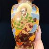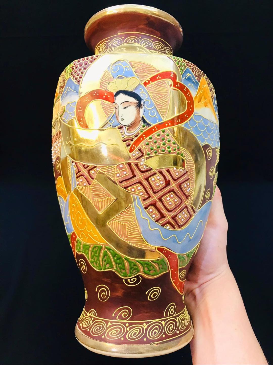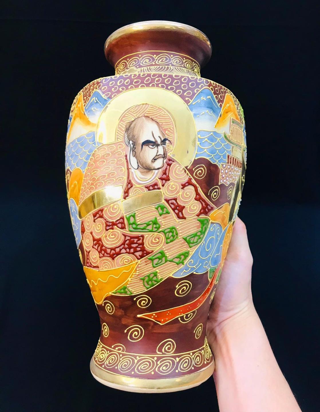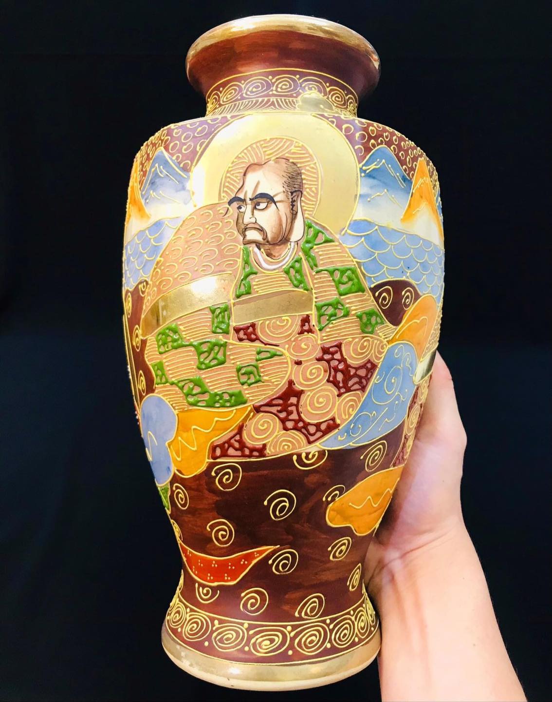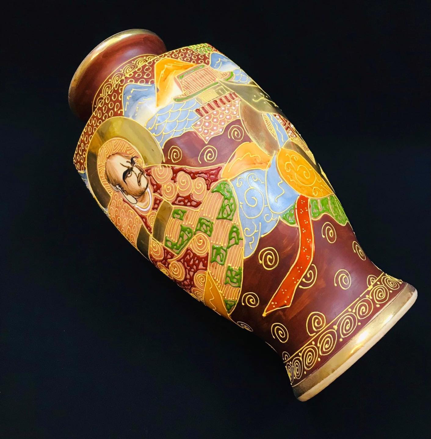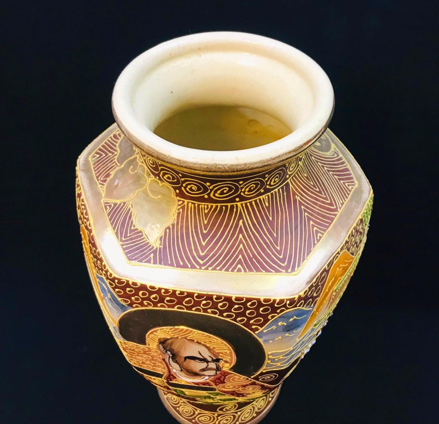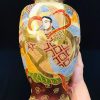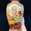 Bình gốm Satsuma dáng lục giác vẽ tích phật La Hán vẽ nổi vẽ vàng