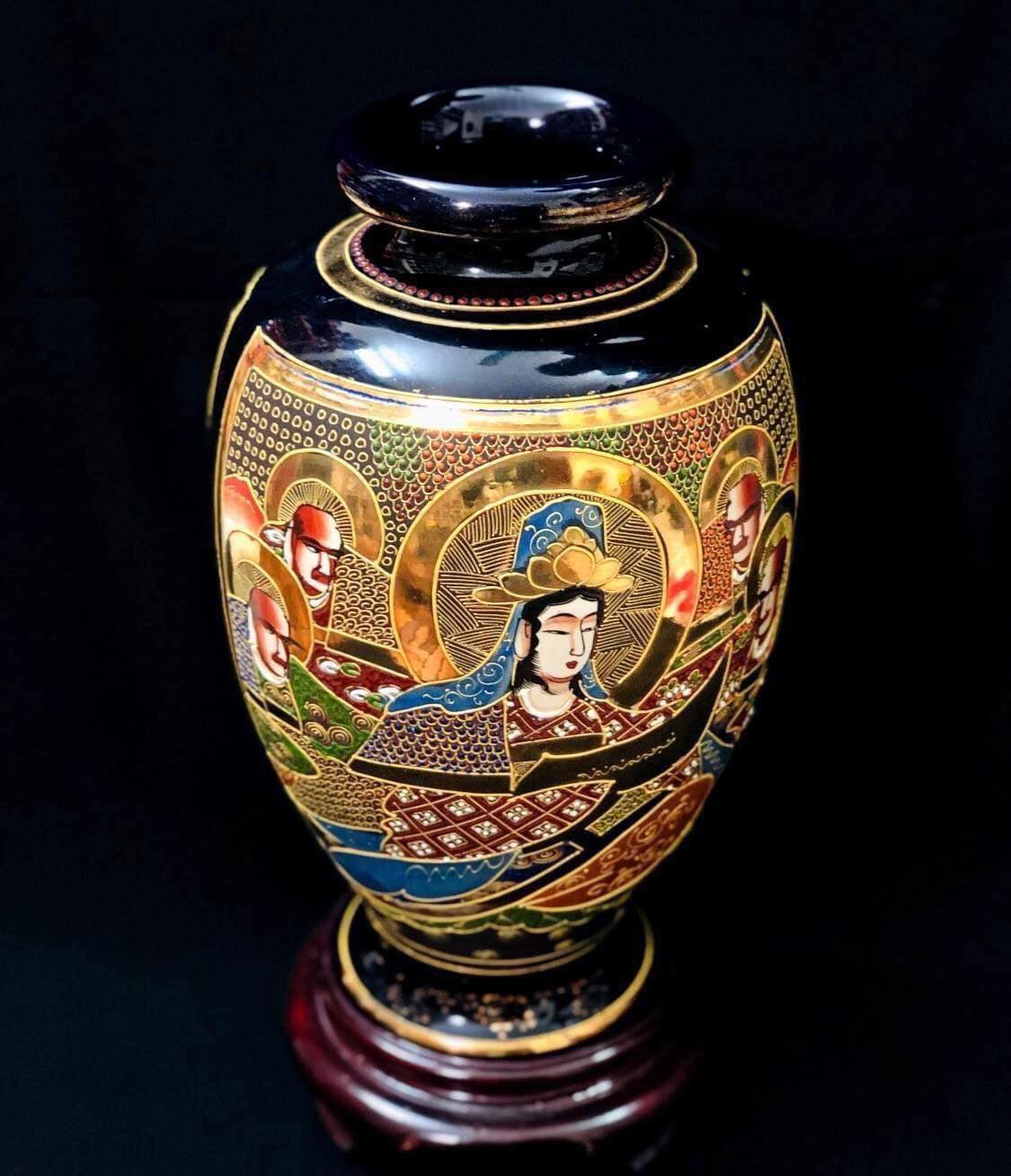 Bình Satsuma xanh Cobalt vẽ vàng tích phật