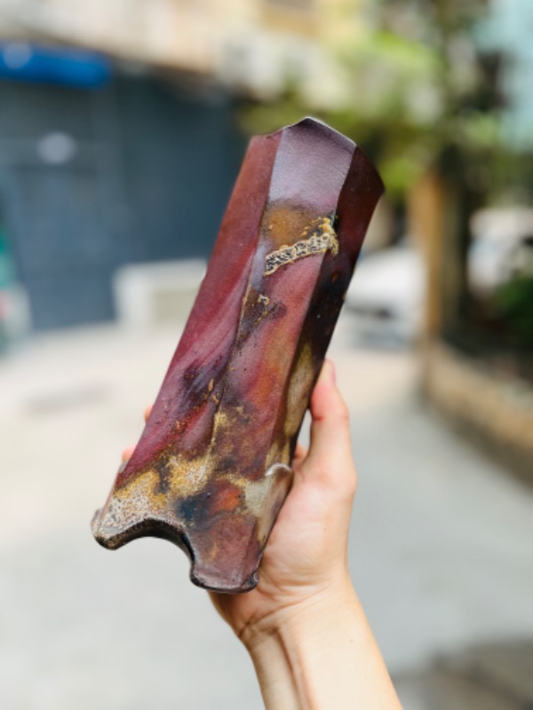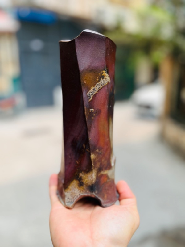 Bizen bình gốm Nhật hoả biến khét lẹt dáng trụ cốt dày dặn. Kích thước cao ~23cm. Hoả biến nung củi thủ công. Triện ạ.