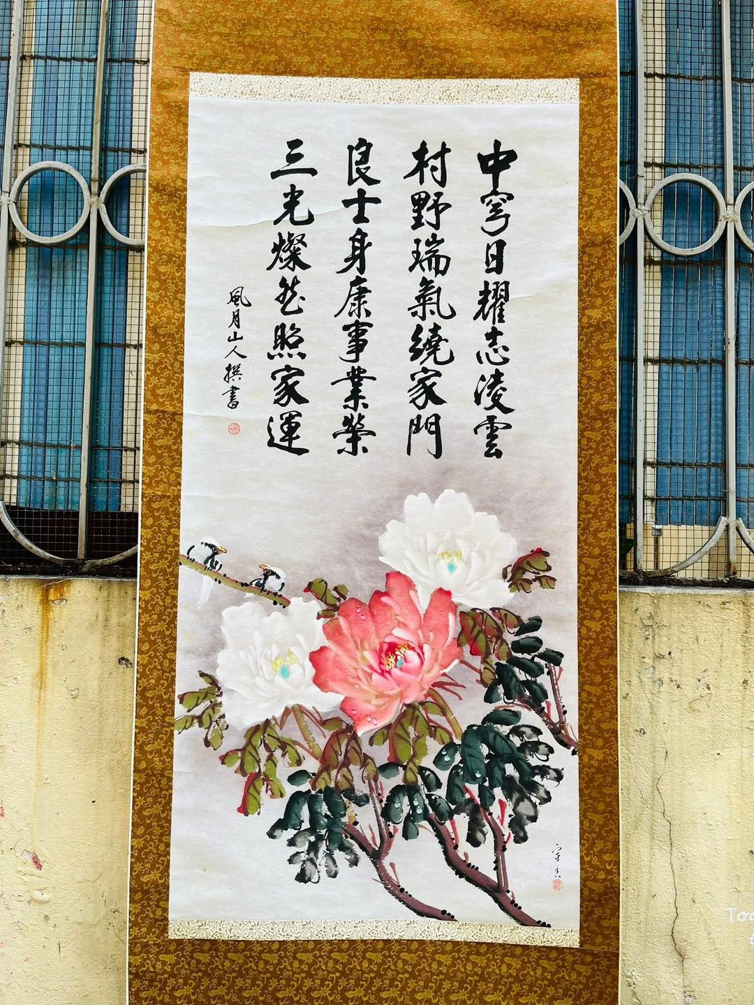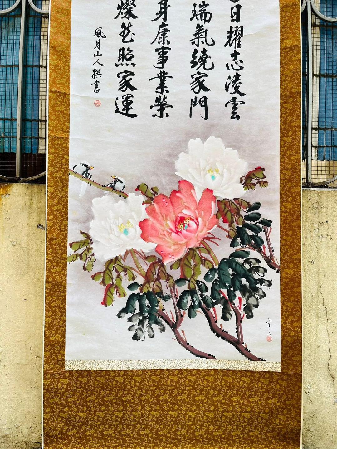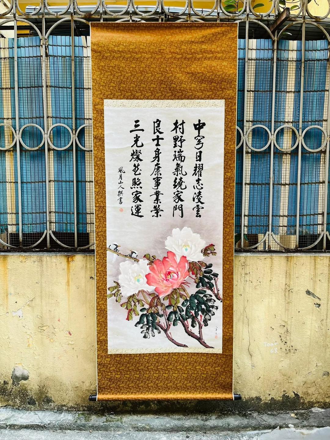 Bức Tranh Cuộn Bồi Gấm Vẽ Mẫu Đơn Và Bài Thơ Rất Đẹp Mời Các Bác Ngắm Và Sưu Tầm