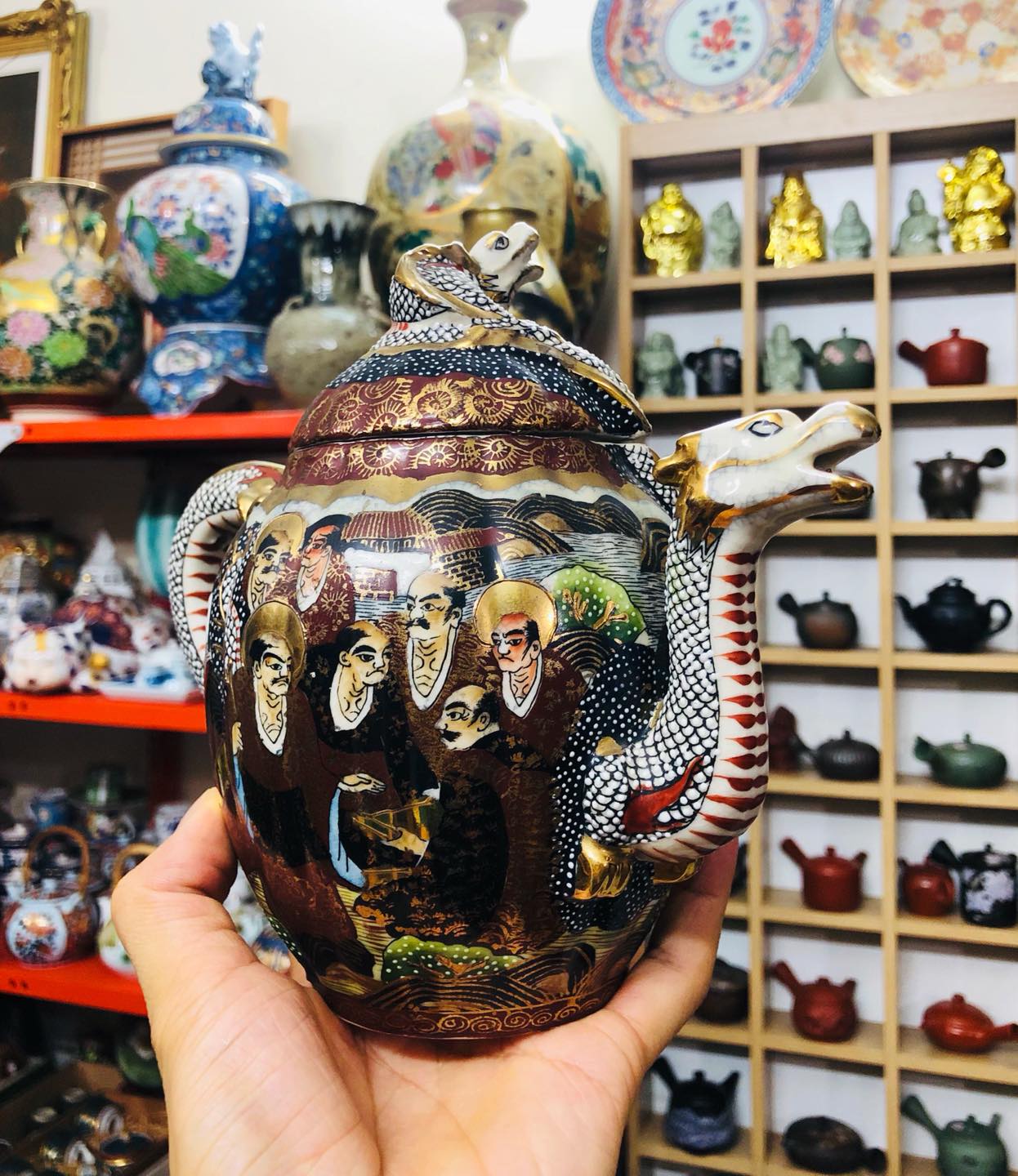 Ấm Satsuma cổ thời kỳ Minh Trị (明治時代) Meiji 1868 -1912) tích Rồng và Phật La Hán đẹp tiệm mời cả nhà ngắm và sưu tầm