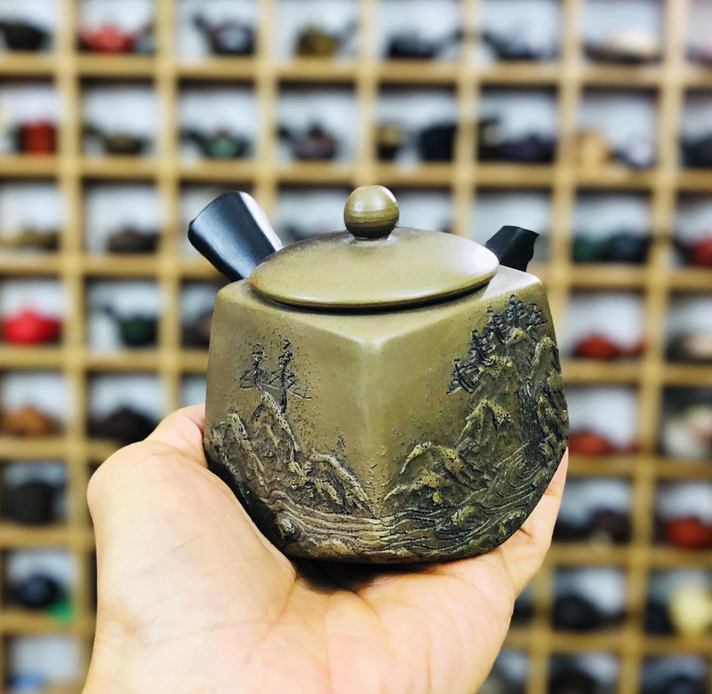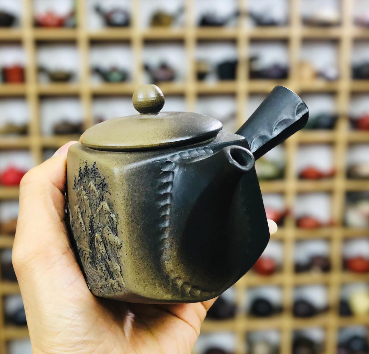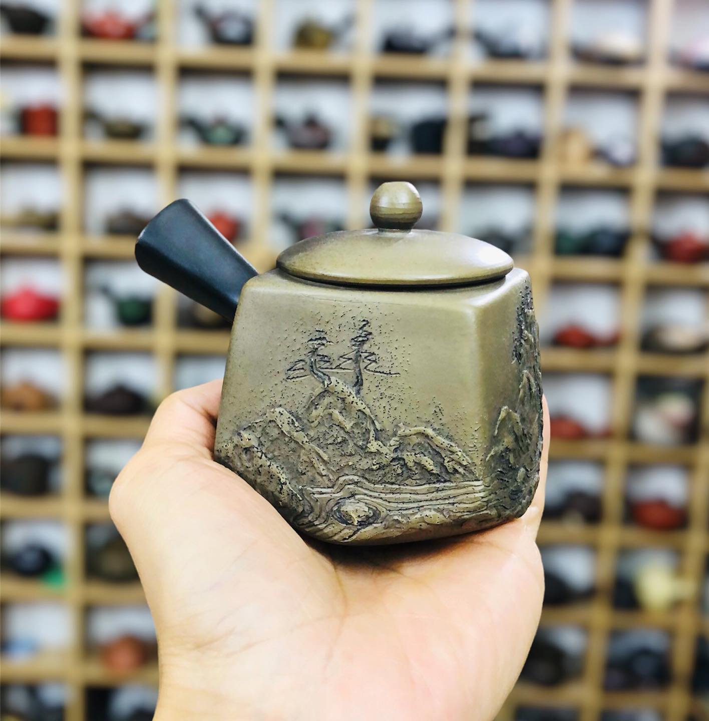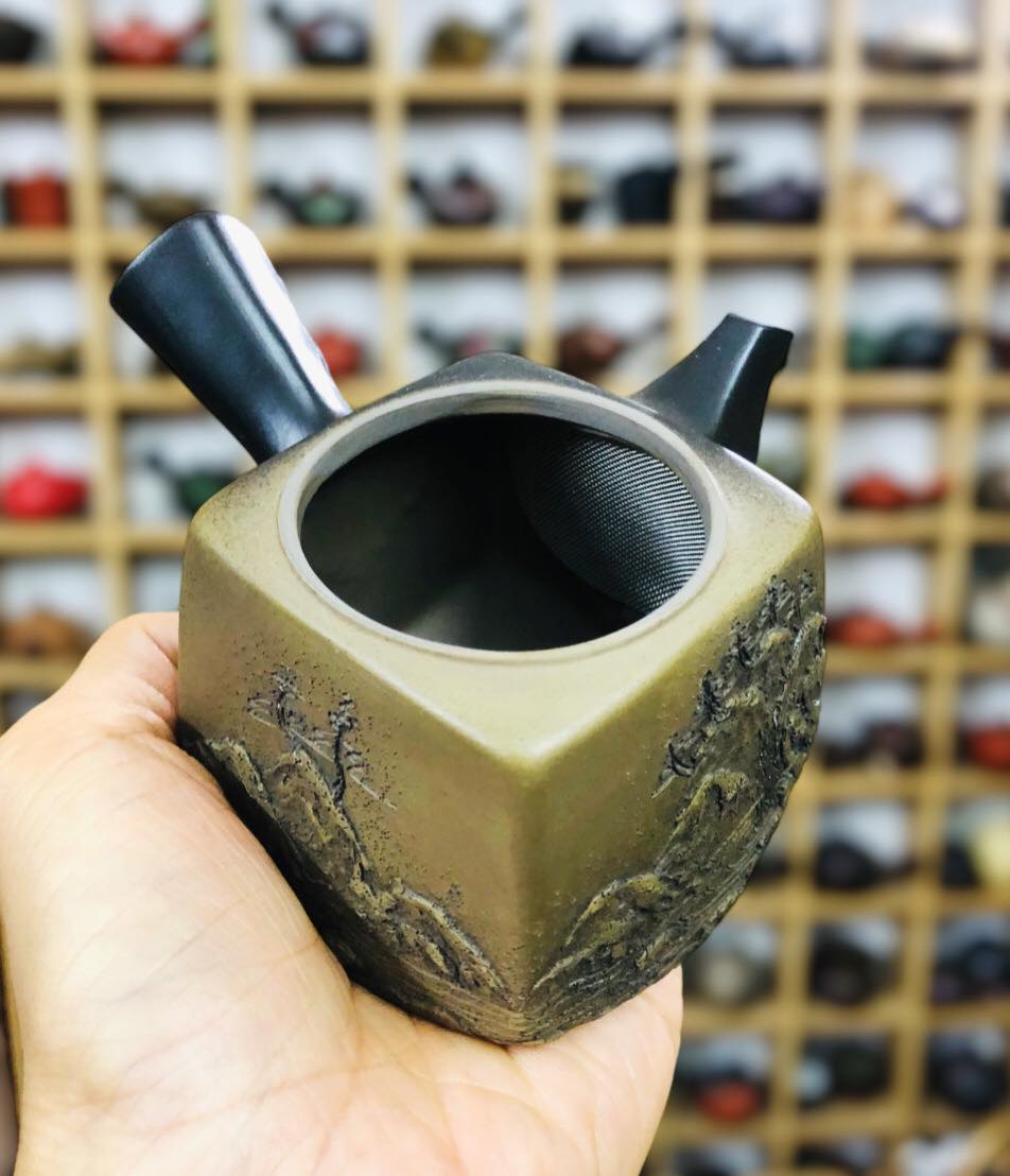 – Ấm dáng tứ phương hoa tiết nổi 3d Sơn Thuỷ rất đẹp và nghệ thuật