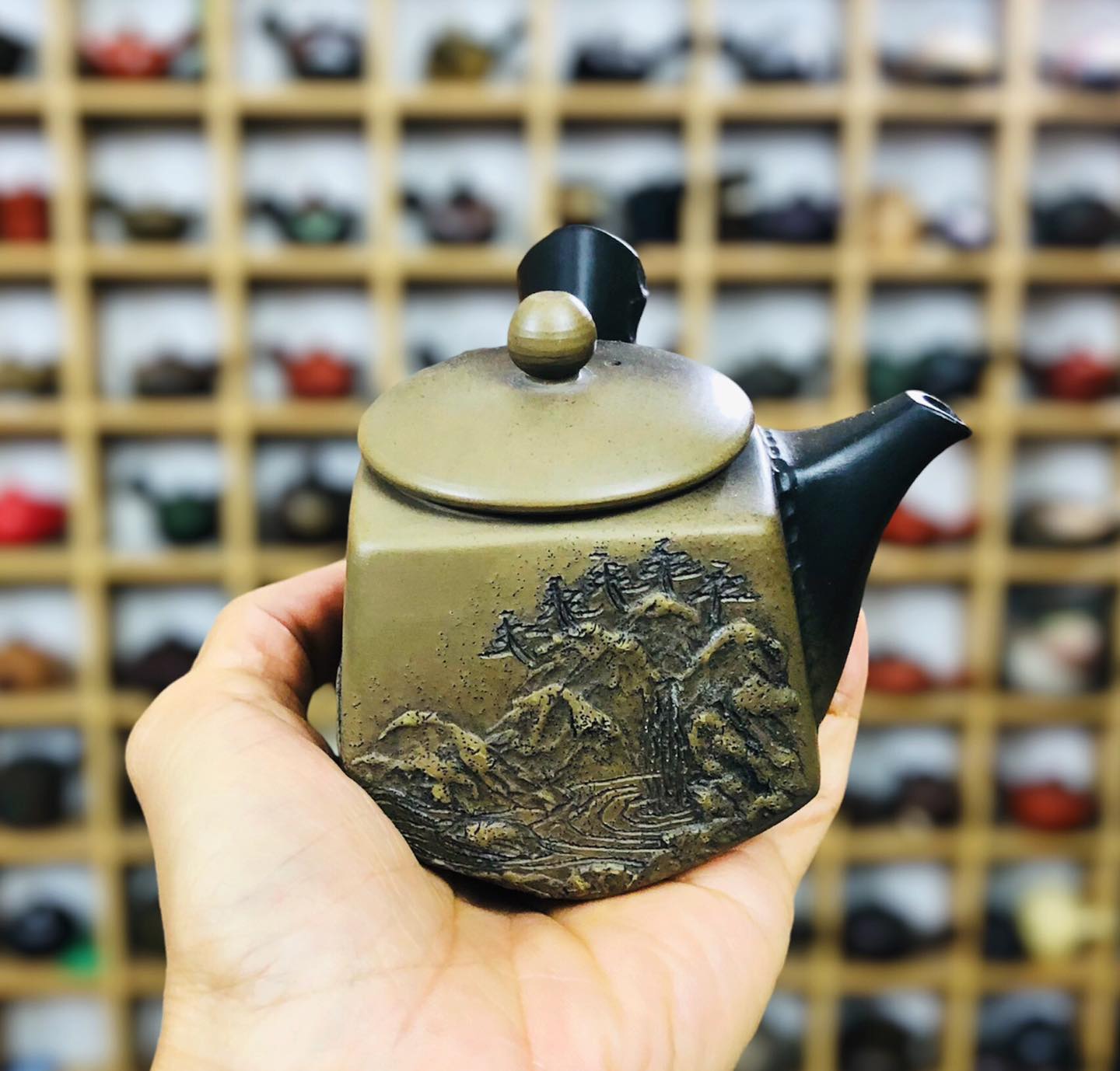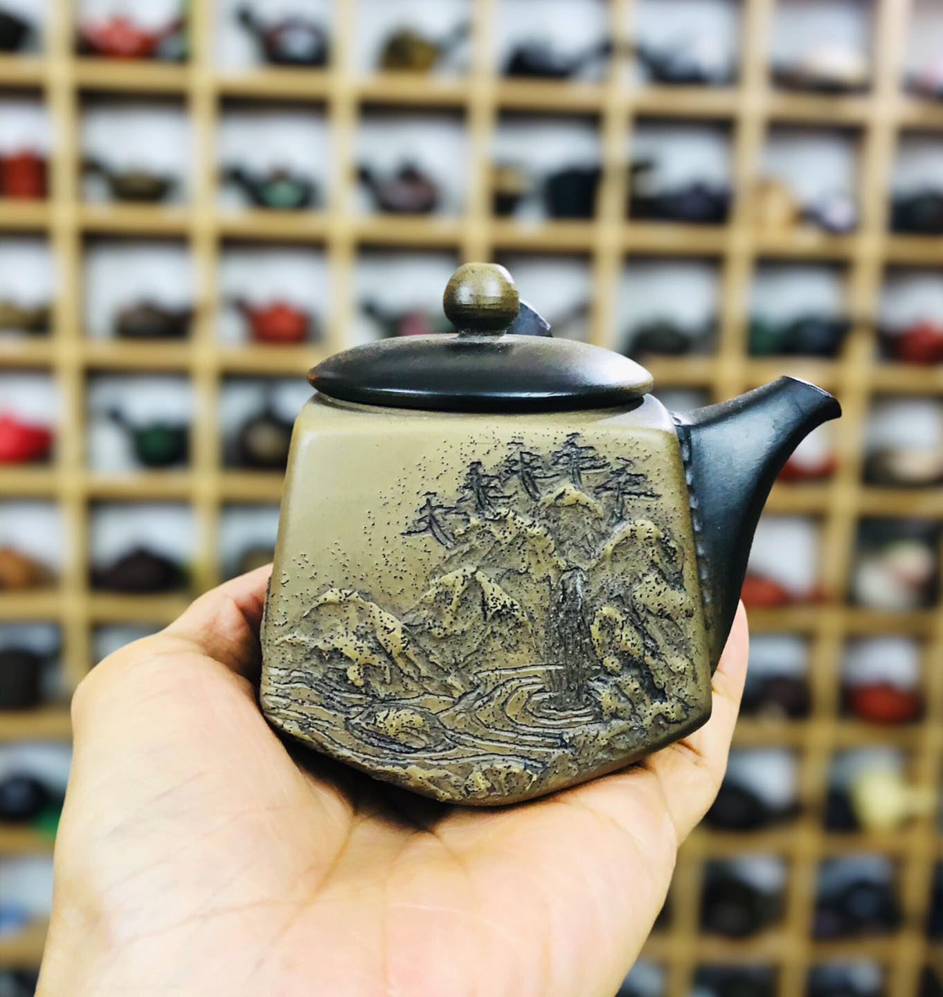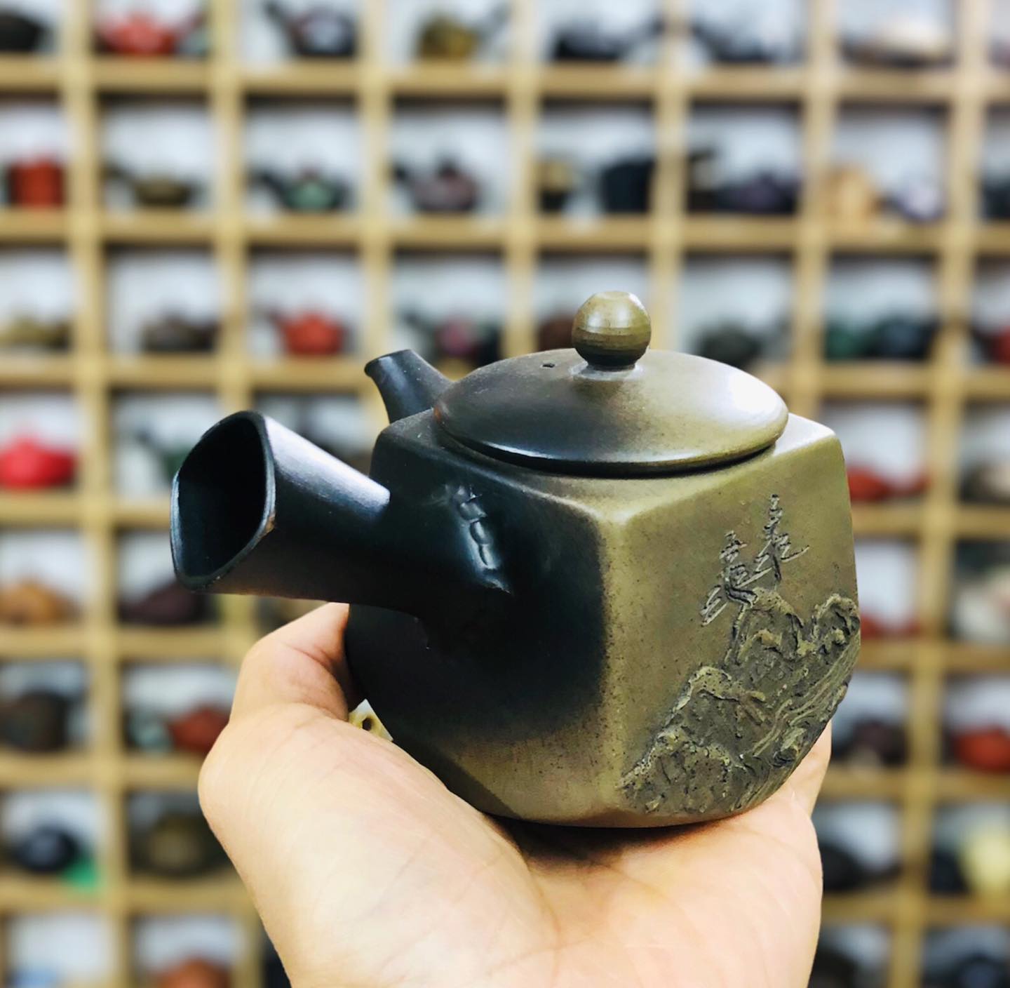 – Ấm dáng tứ phương hoa tiết nổi 3d Sơn Thuỷ rất đẹp và nghệ thuật