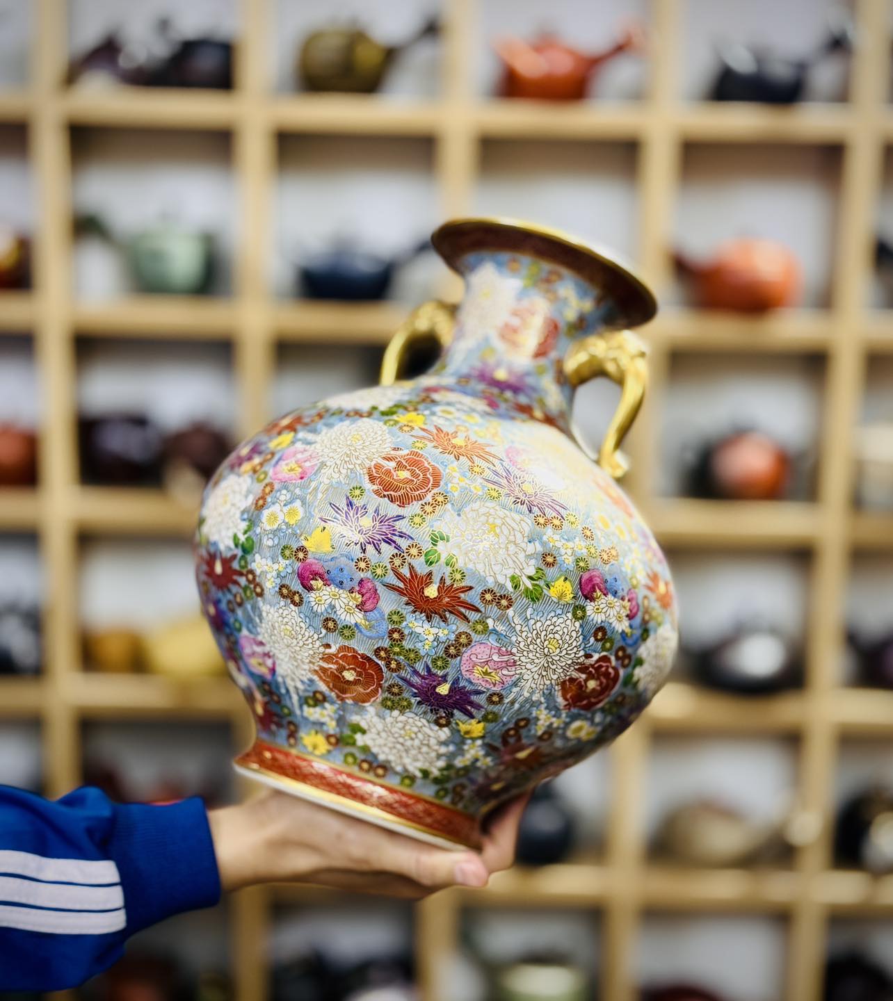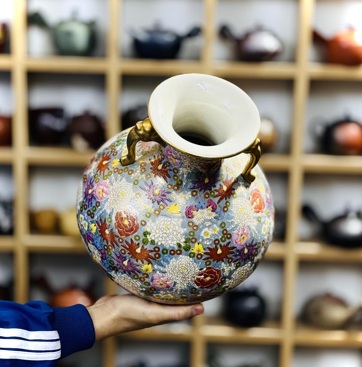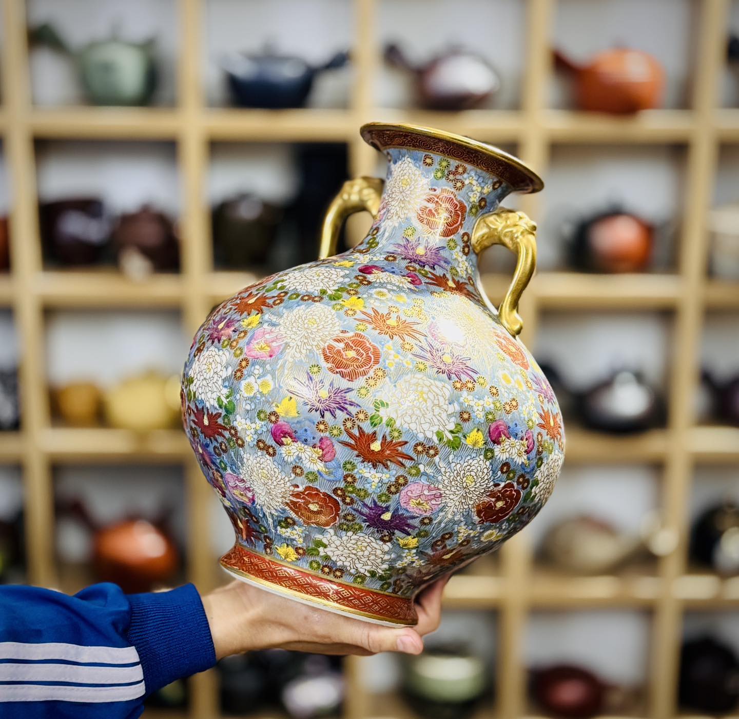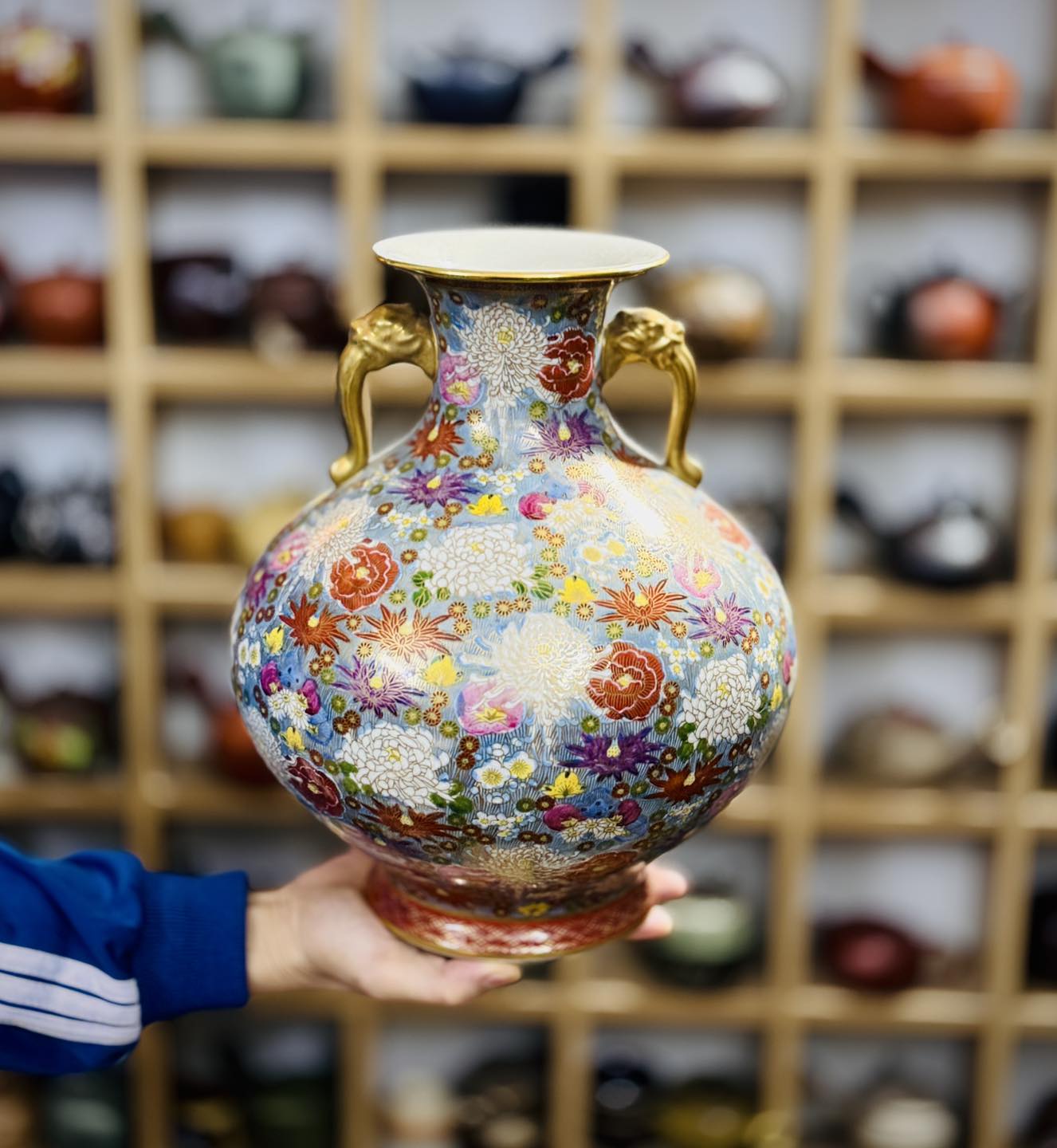– Bình vẽ bách hoa vẽ tay thủ công, hoạ tiết vẽ vàng, nổi cộm, rất đẹp và sắc nét, bình vẽ full tứ diện, bên tai rồng nạm vàng