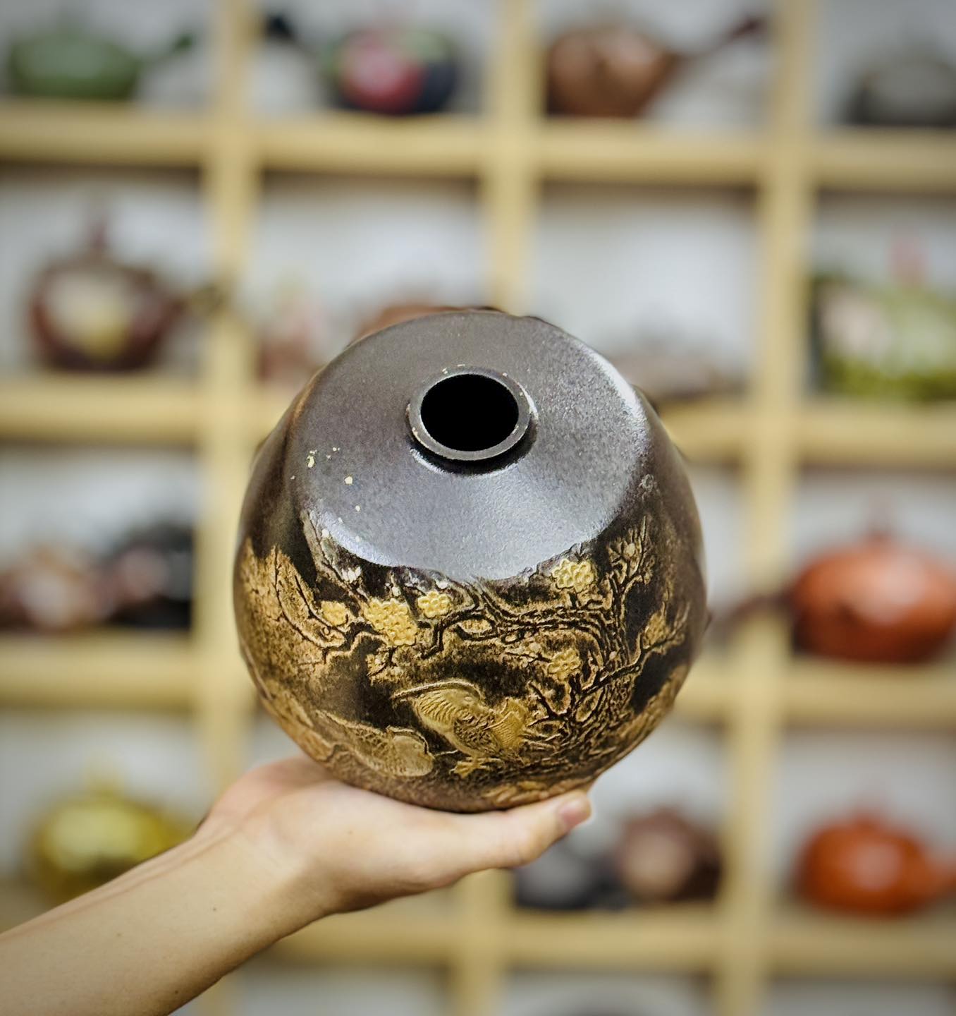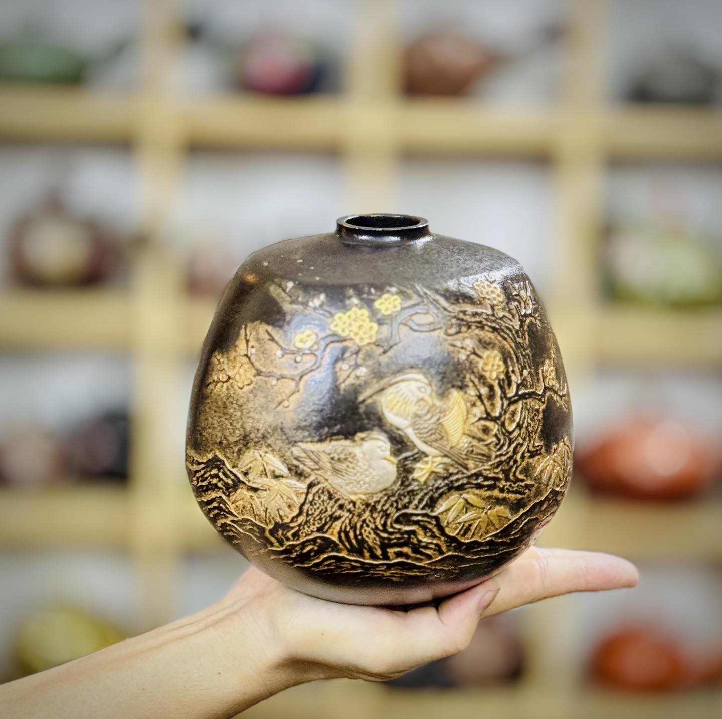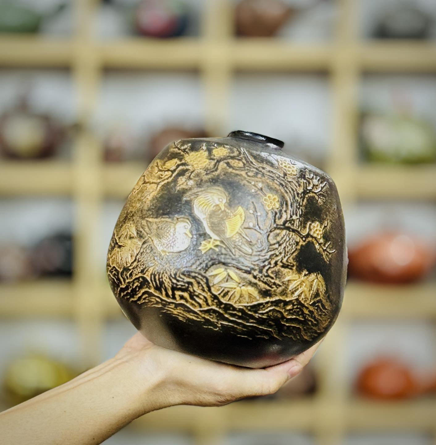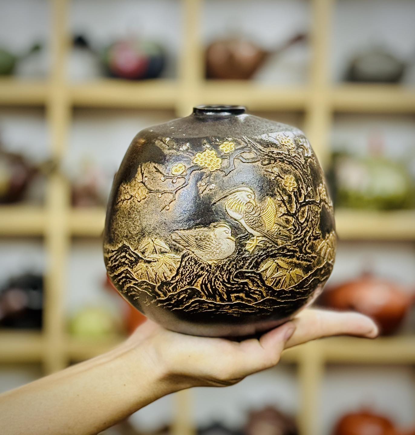 – Hoạ tiết khảm nổi chi tiết đôi uyên ương, khóm trúc, cội mai rất đẹp