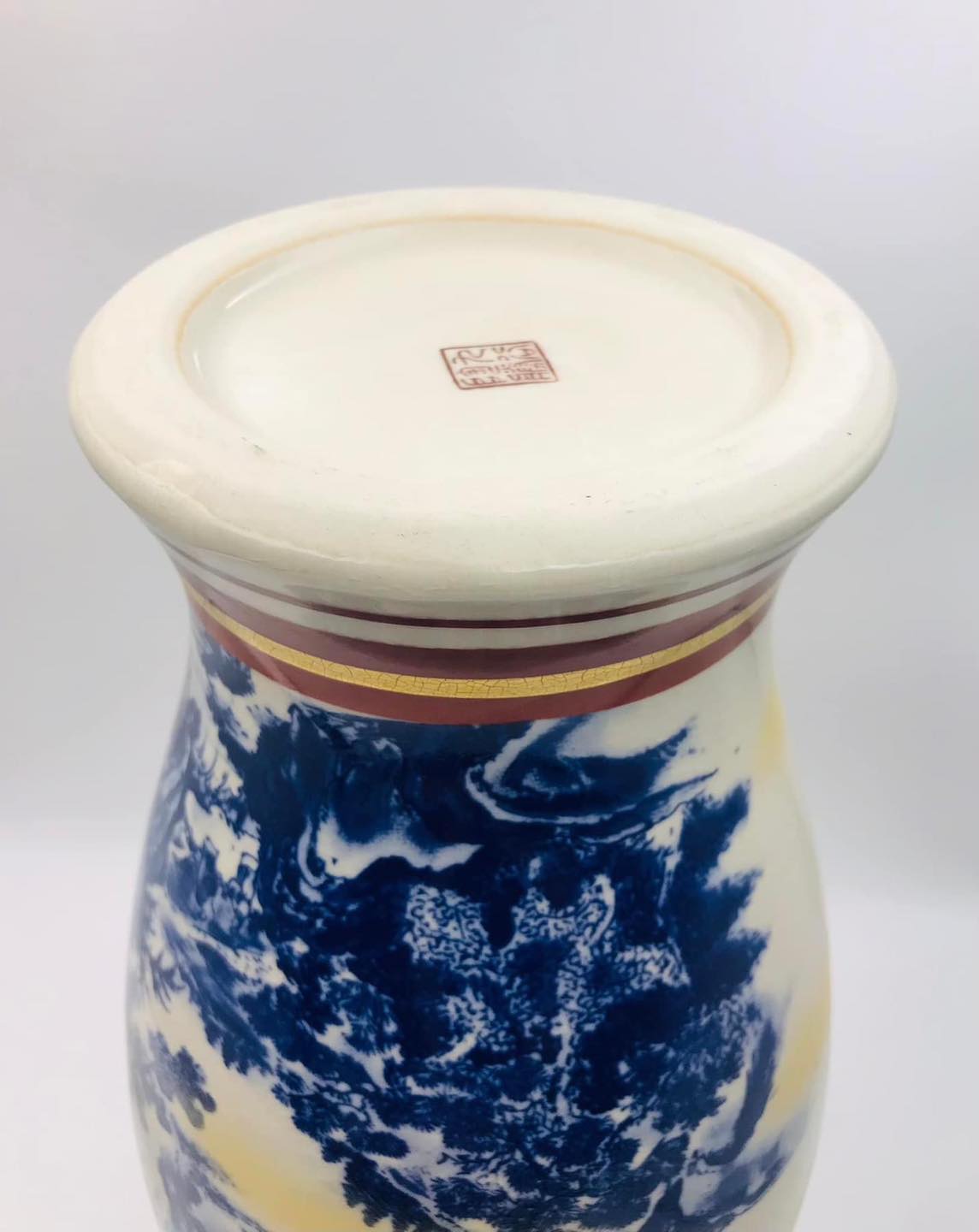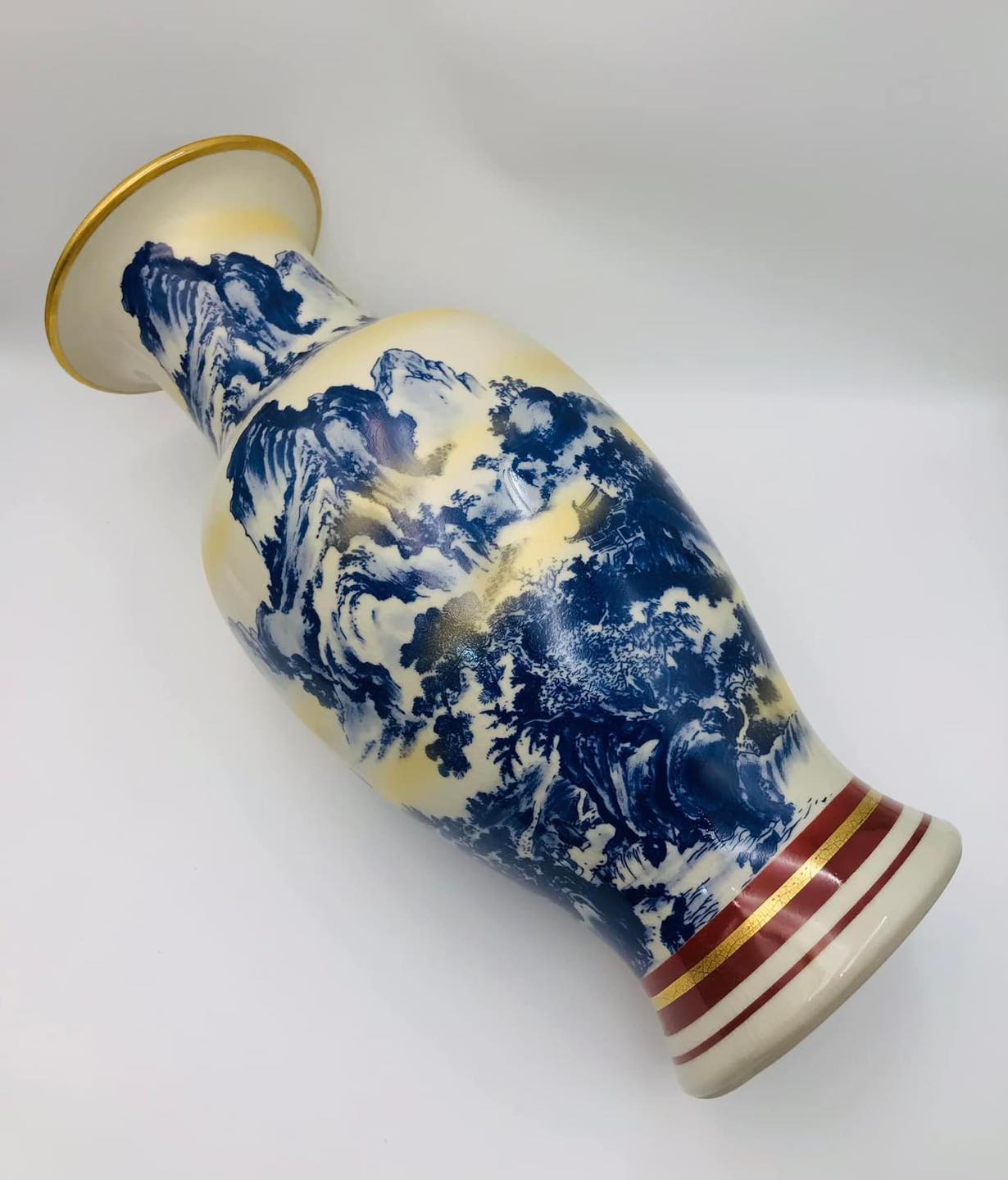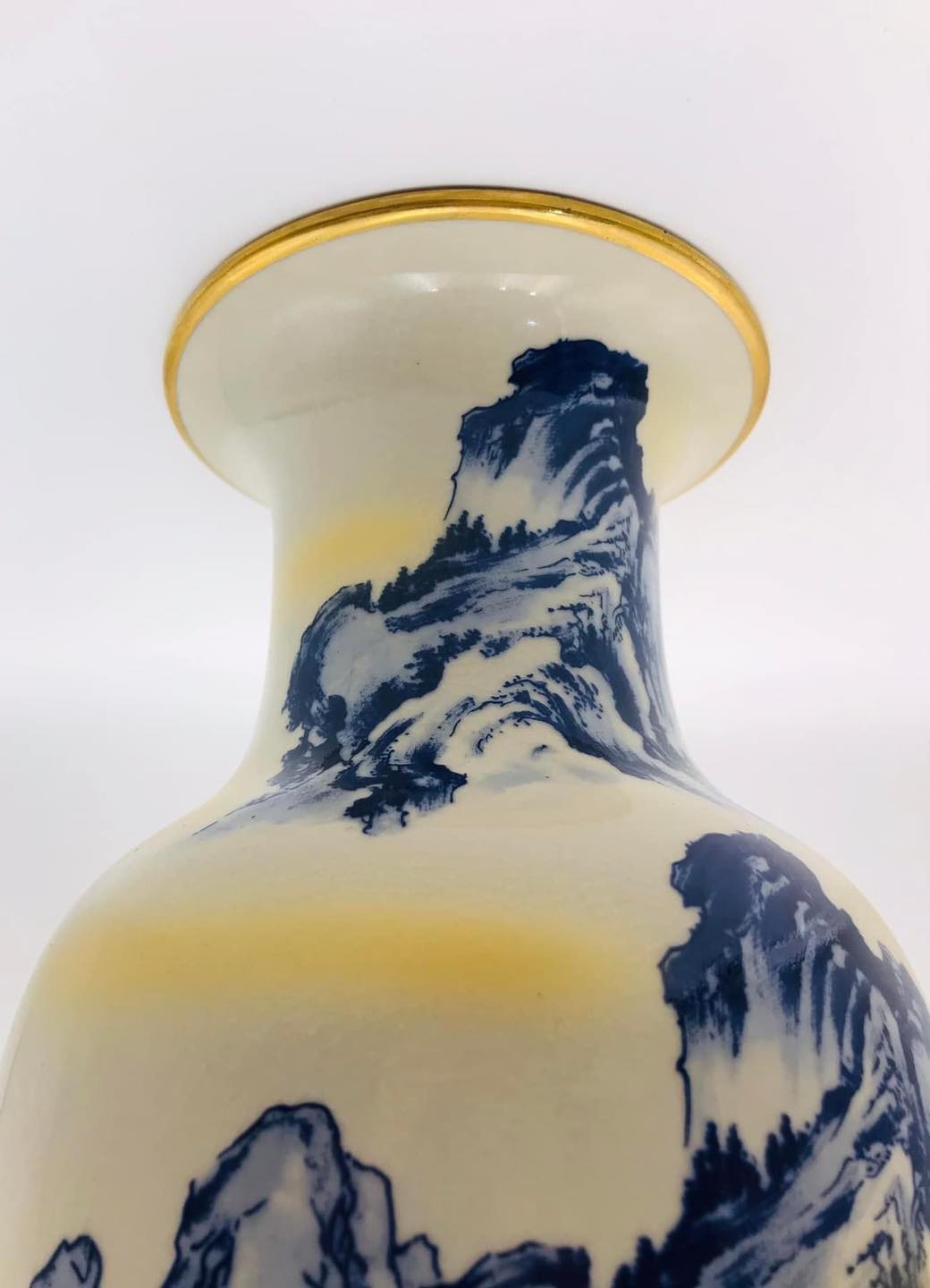 – Hoa văn vẽ tay vẽ vàng men lam Sơn Thuỷ Tùng Đình vẽ tứ diện tỉ mỉ, sắc nét, viền vàng sang trọng