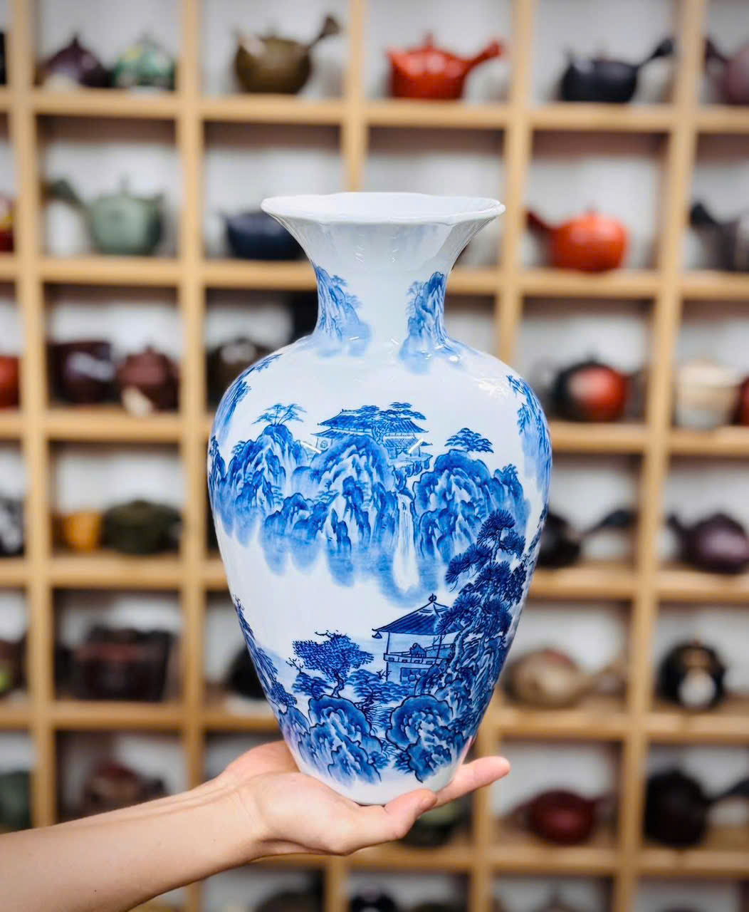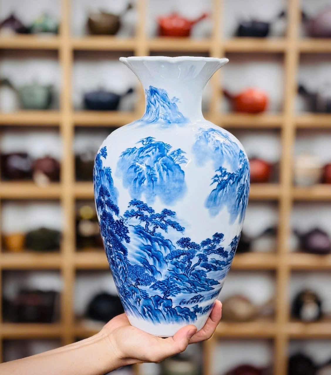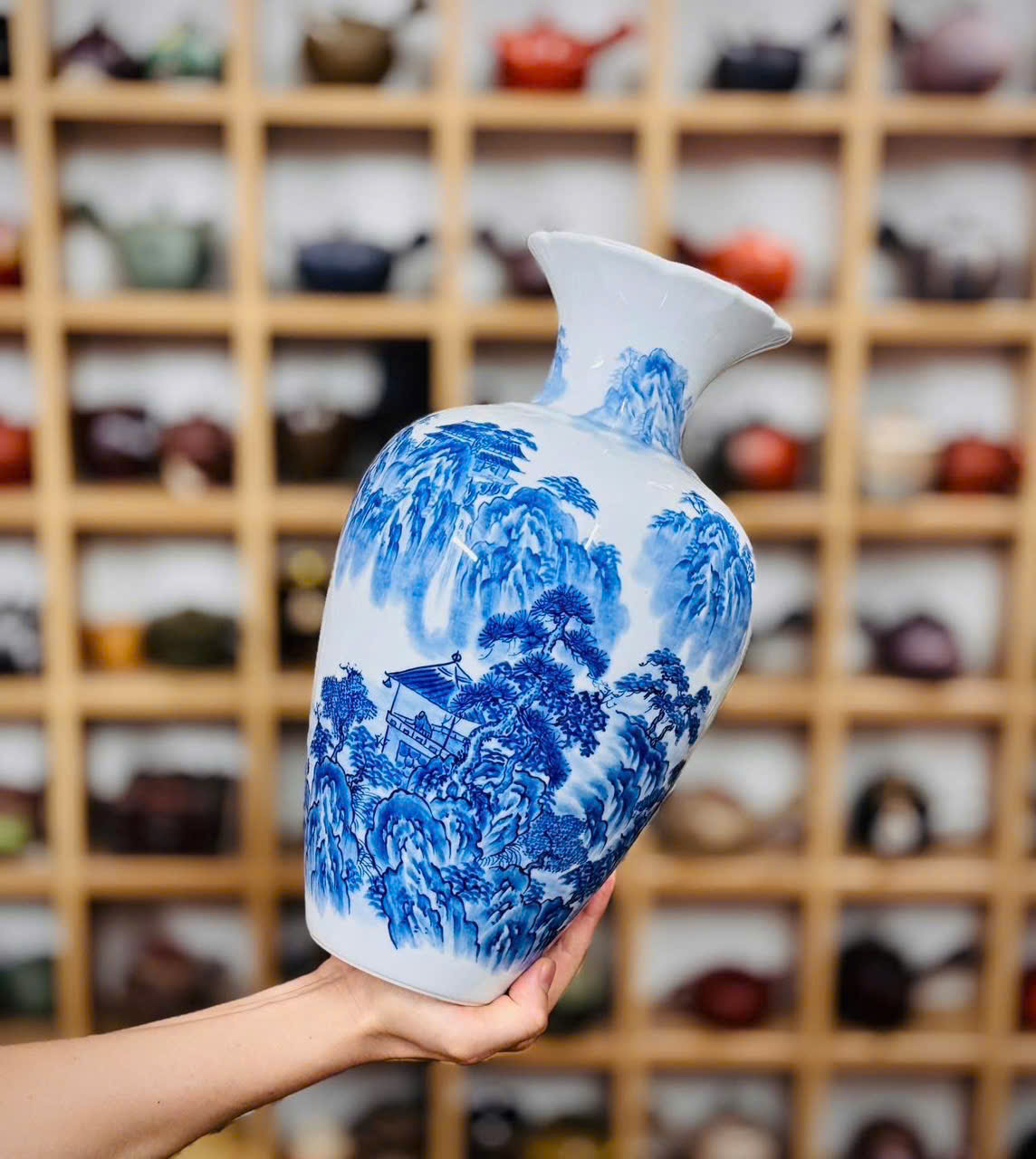 Bình men lam vẽ tay sơn thuỷ cho các bác ngắm và sưu tầm