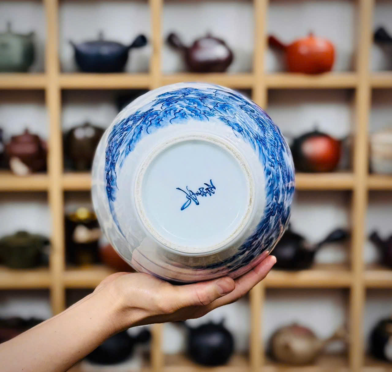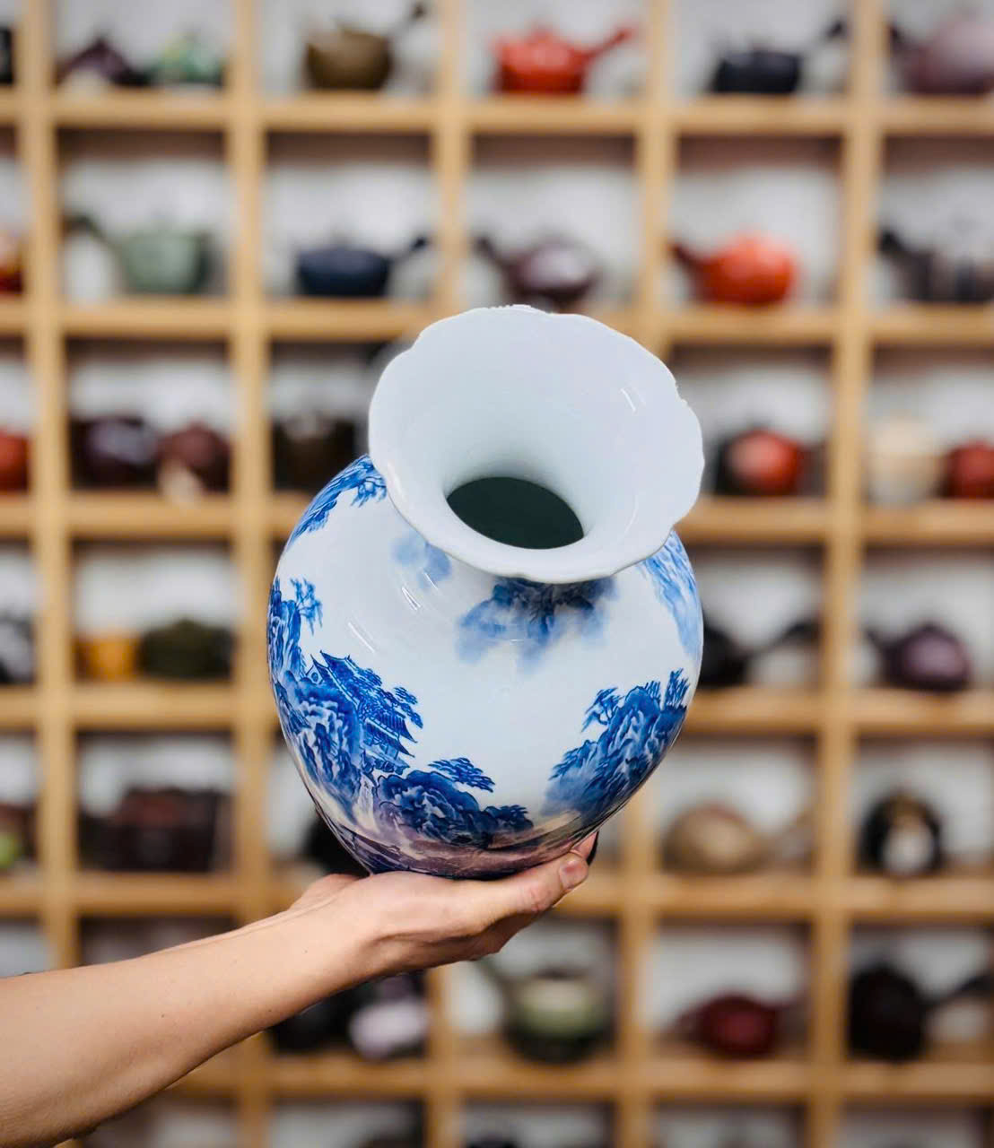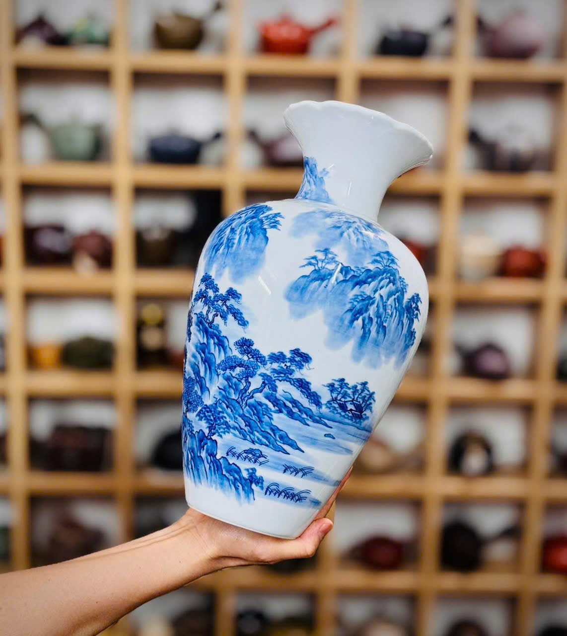 Bình men lam vẽ tay sơn thuỷ cho các bác ngắm và sưu tầm