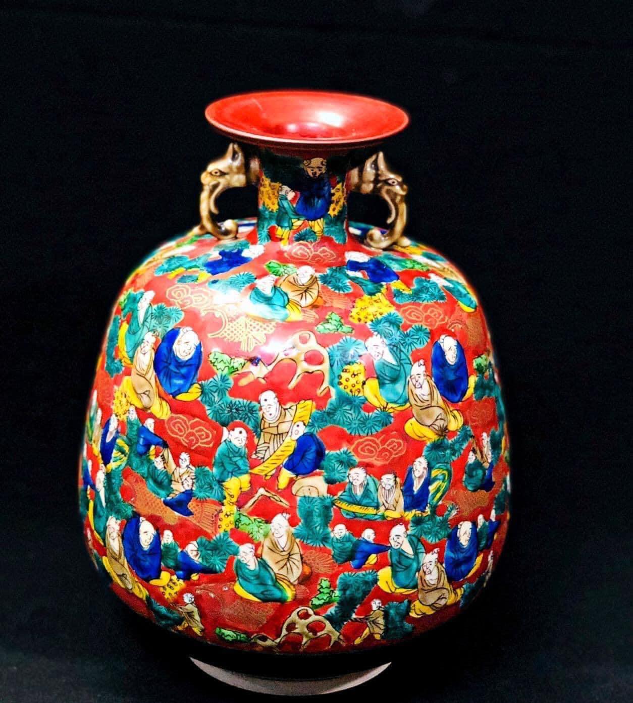 – Toàn thân bình được vẽ tay toàn bộ mô tả cảnh sinh hoạt vui chơi giải trí thời xưa. Màu sắc trên thân bình là màu đỏ gạch đặc trưng cho phong cách Mokubei. Viền quanh đáy bình là màu xanh “chỉ có ở Kutani” – một sắc xanh lục bảo mang ánh xà cừ. Mọi màu sắc và nét vẽ đều đẹp cho một vật phẩm sưu tầm như vậy.