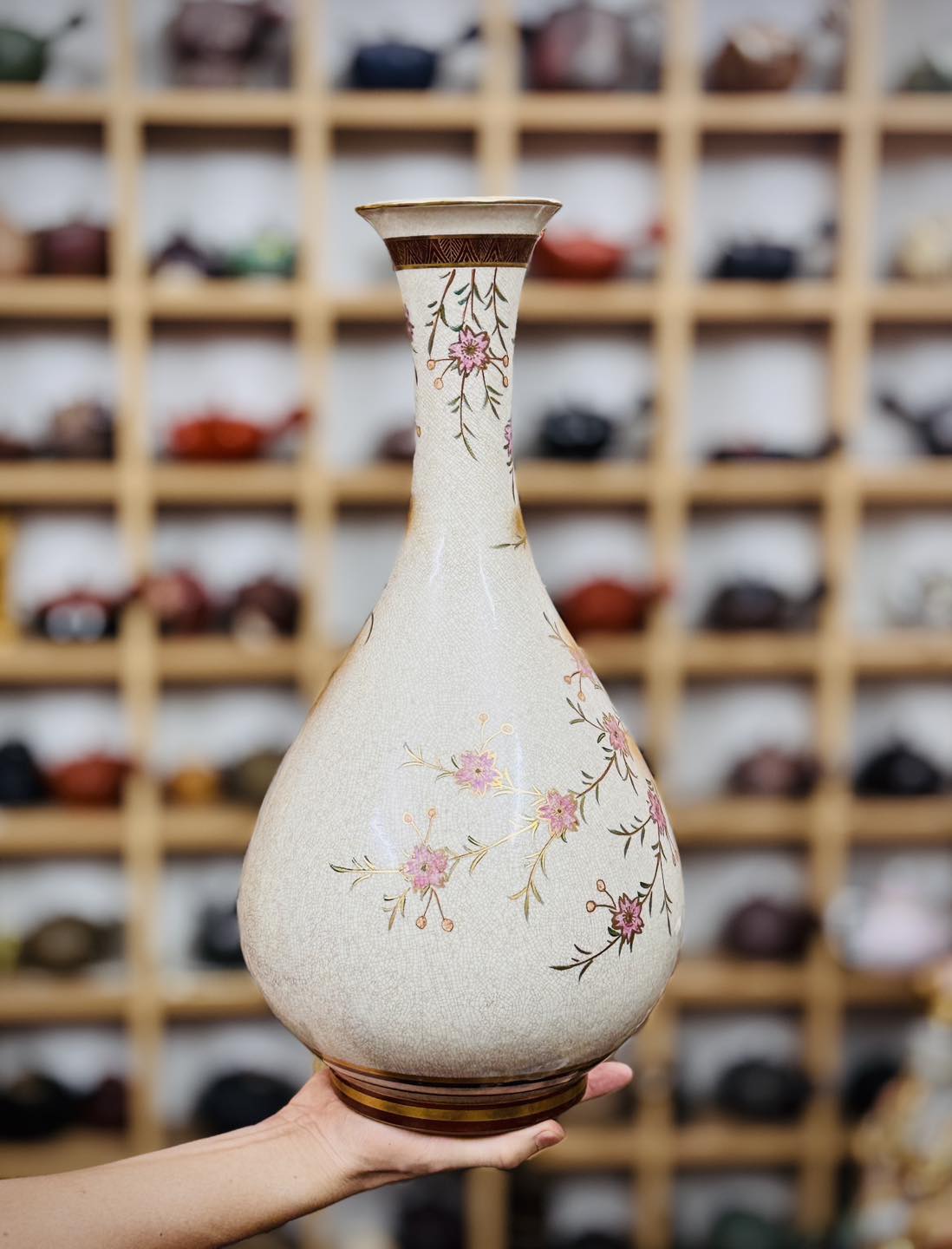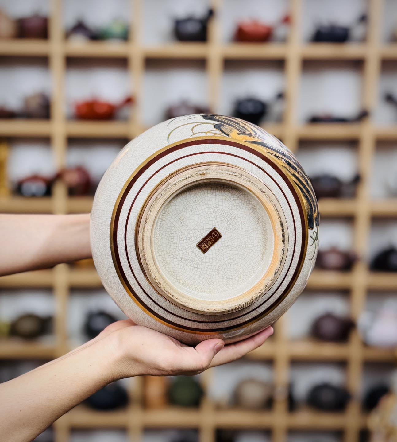 – Bình lớn, dáng bình hút lộc vẽ vàng, hoạ tiết nổi cộm, cốt gốm già, men rạn theo thời gian.