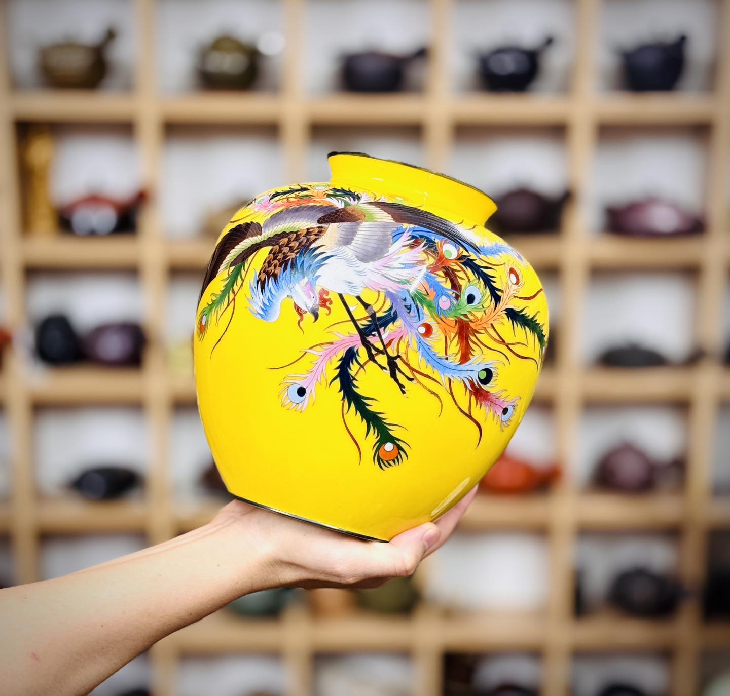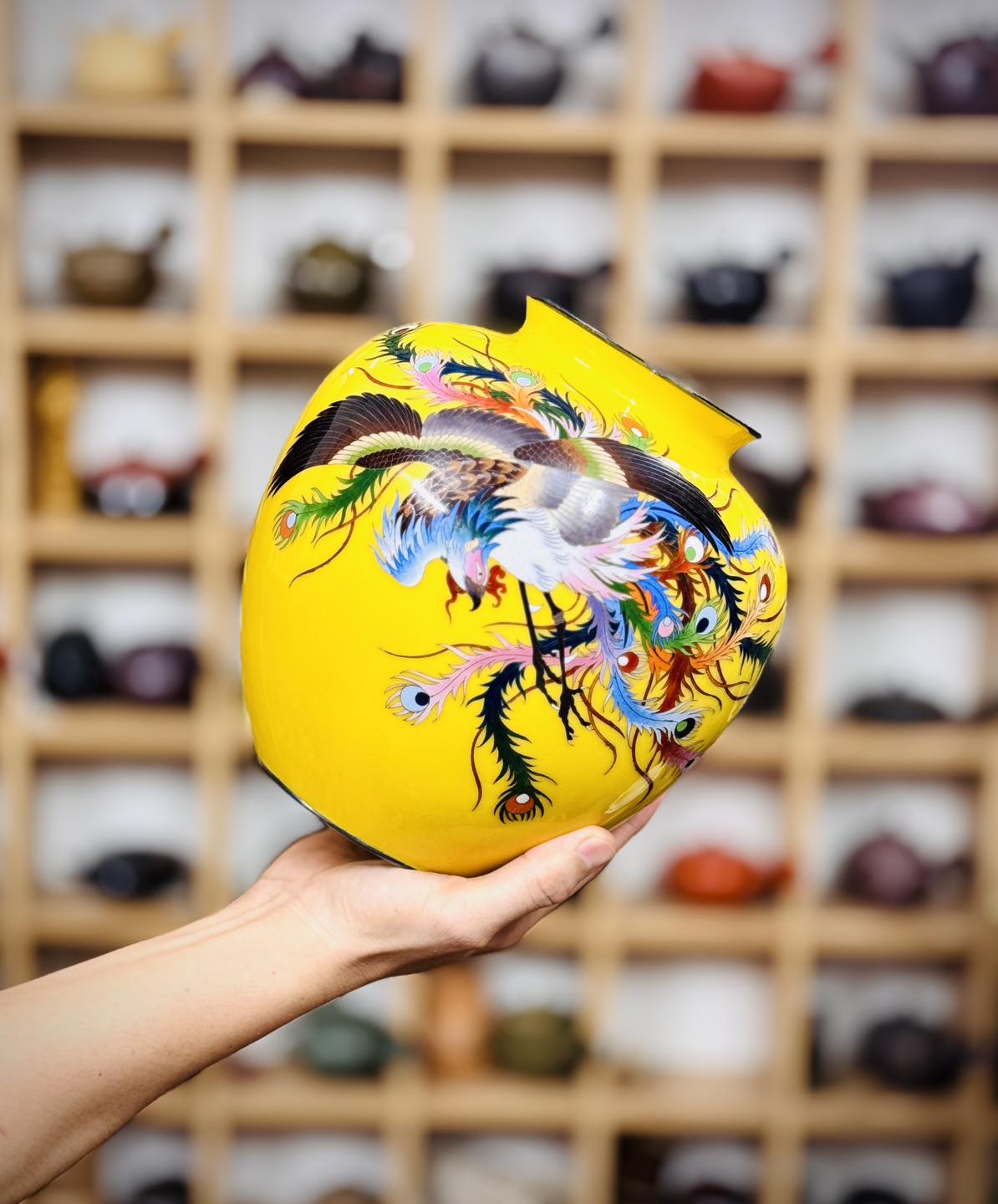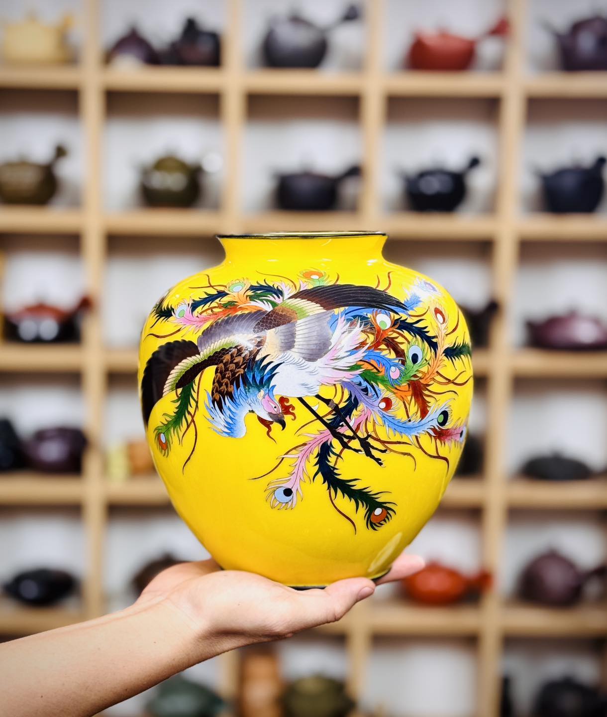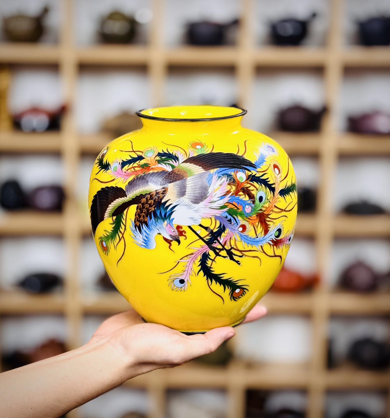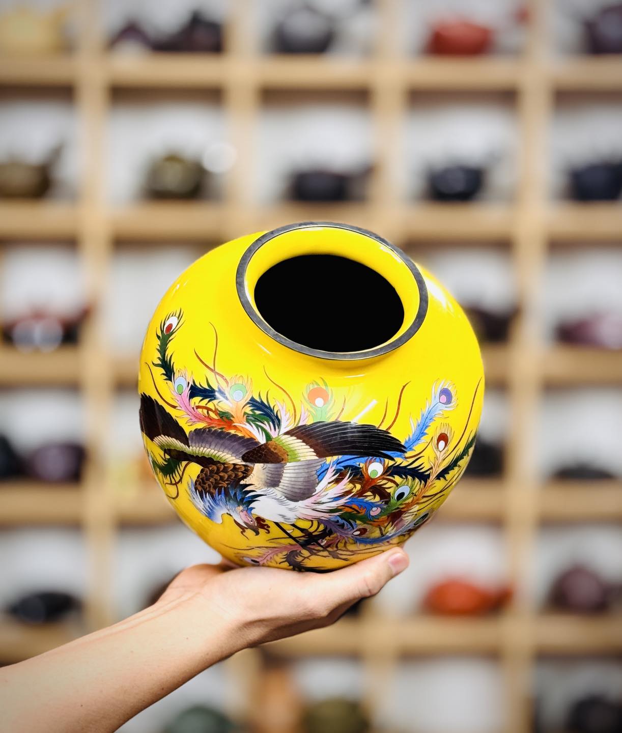 – Bình men vàng hoàng kim một trong nhưng màu giá trị nhất dòng Shippo. Hoạ tiết cẩn phượng hoàng siêu đẹp và có ý nghĩa