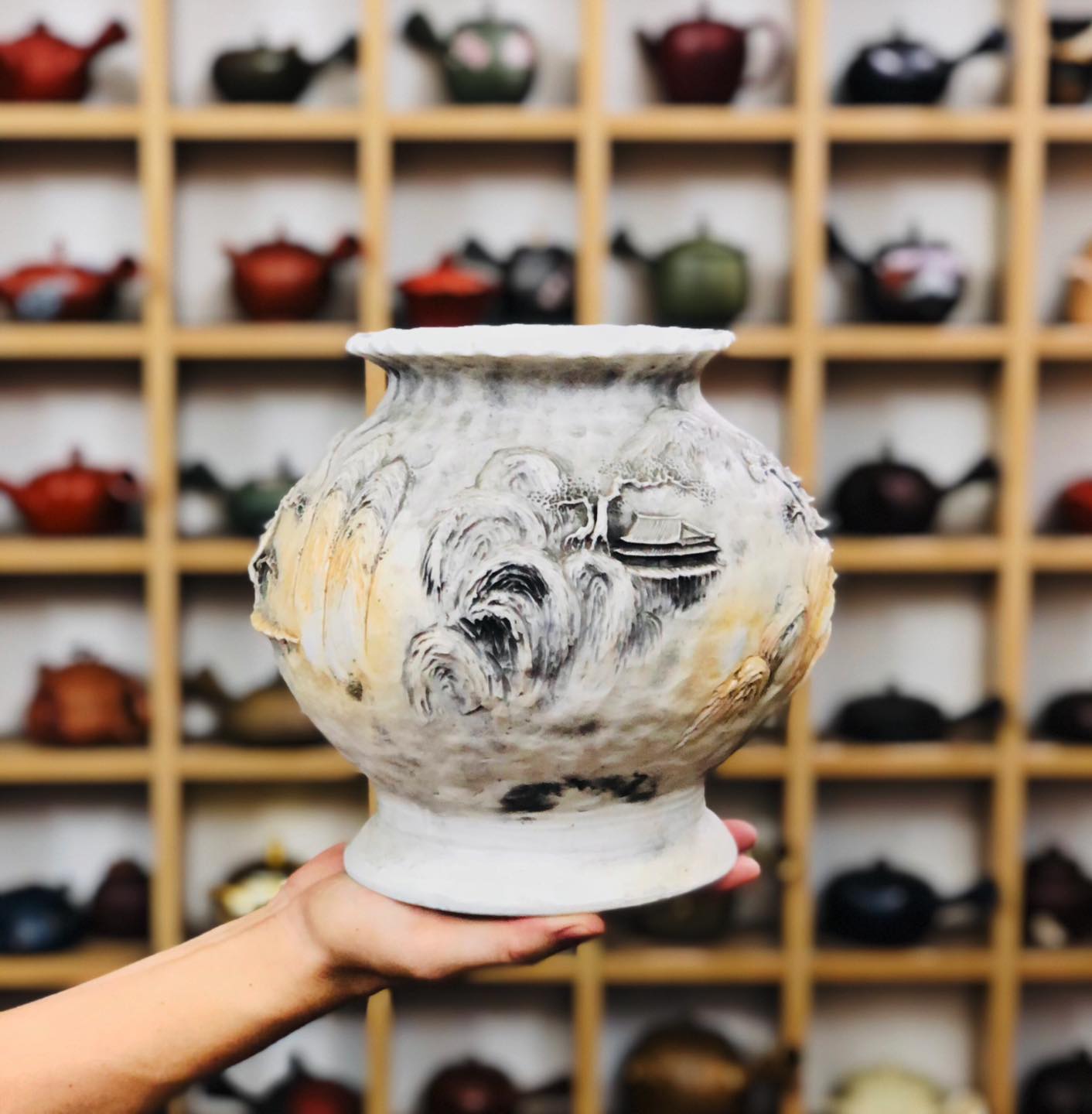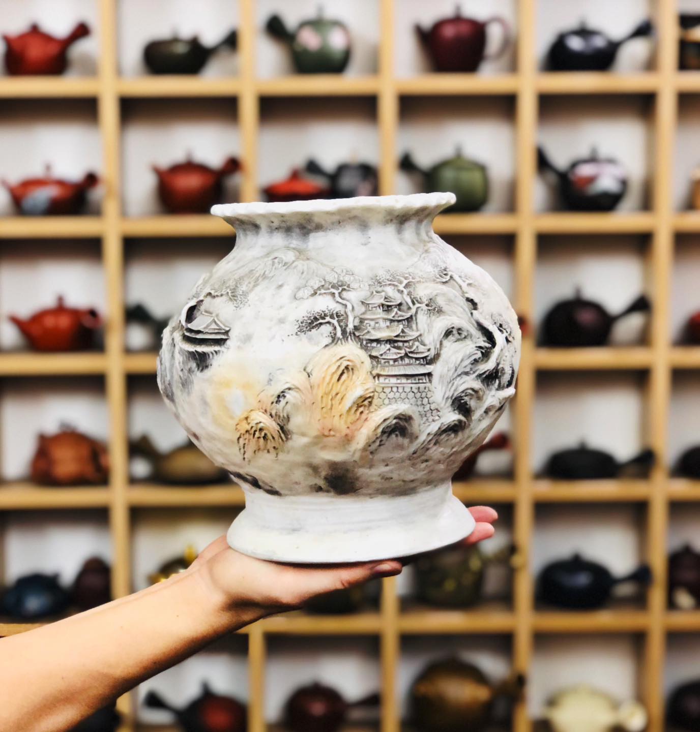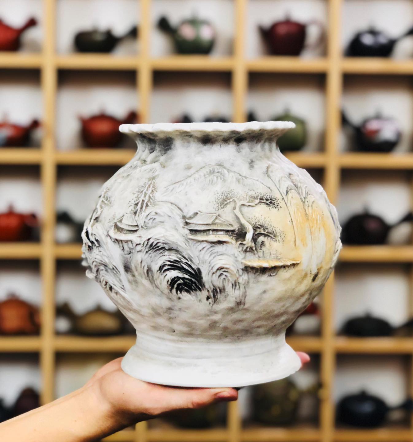 – Bình chế tác thủ công toàn chế, đắp nổi tứ diện tích Sơn Thuỷ Tùng Đình 3D nhìn góc nào cũng như một bức tranh.