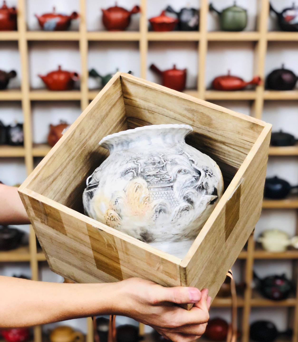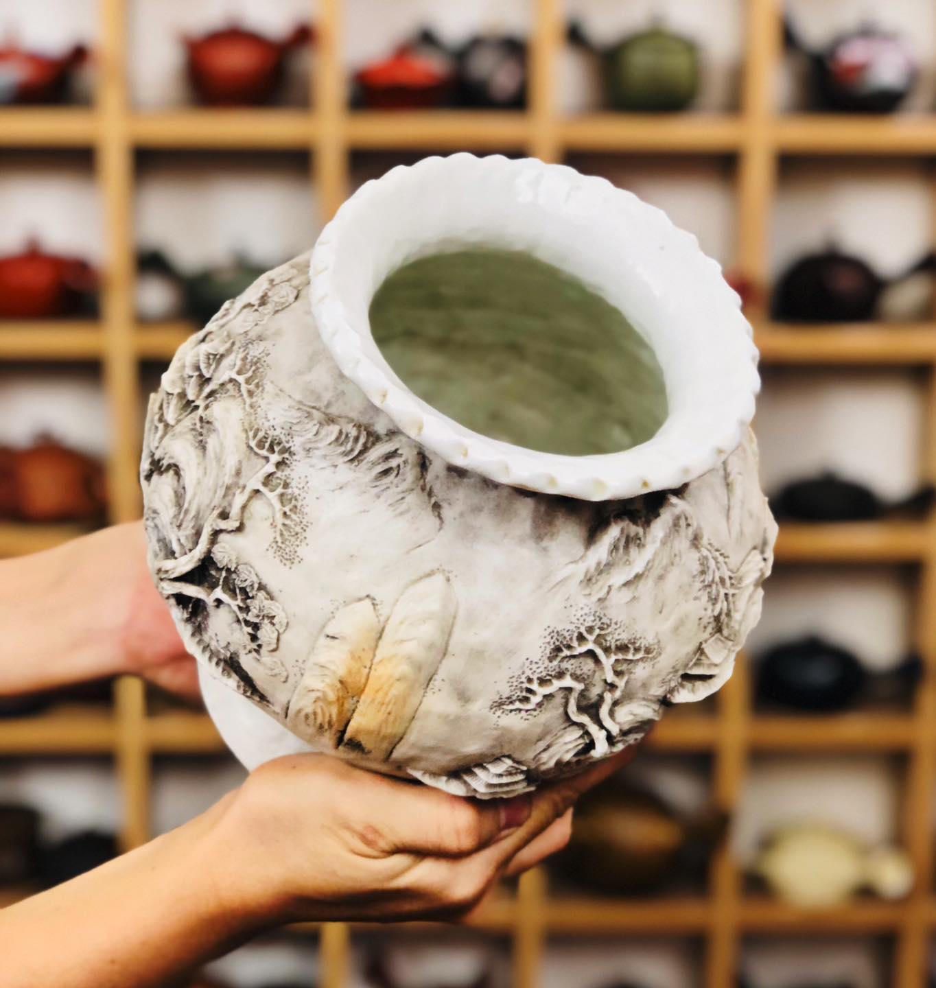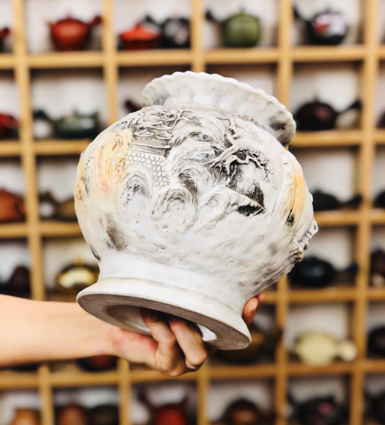 – Bình chế tác thủ công toàn chế, đắp nổi tứ diện tích Sơn Thuỷ Tùng Đình 3D nhìn góc nào cũng như một bức tranh.