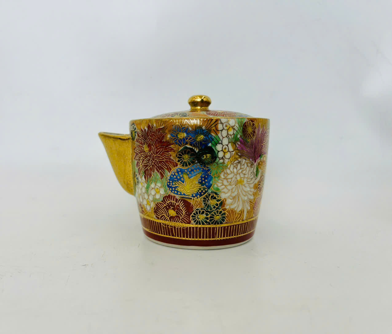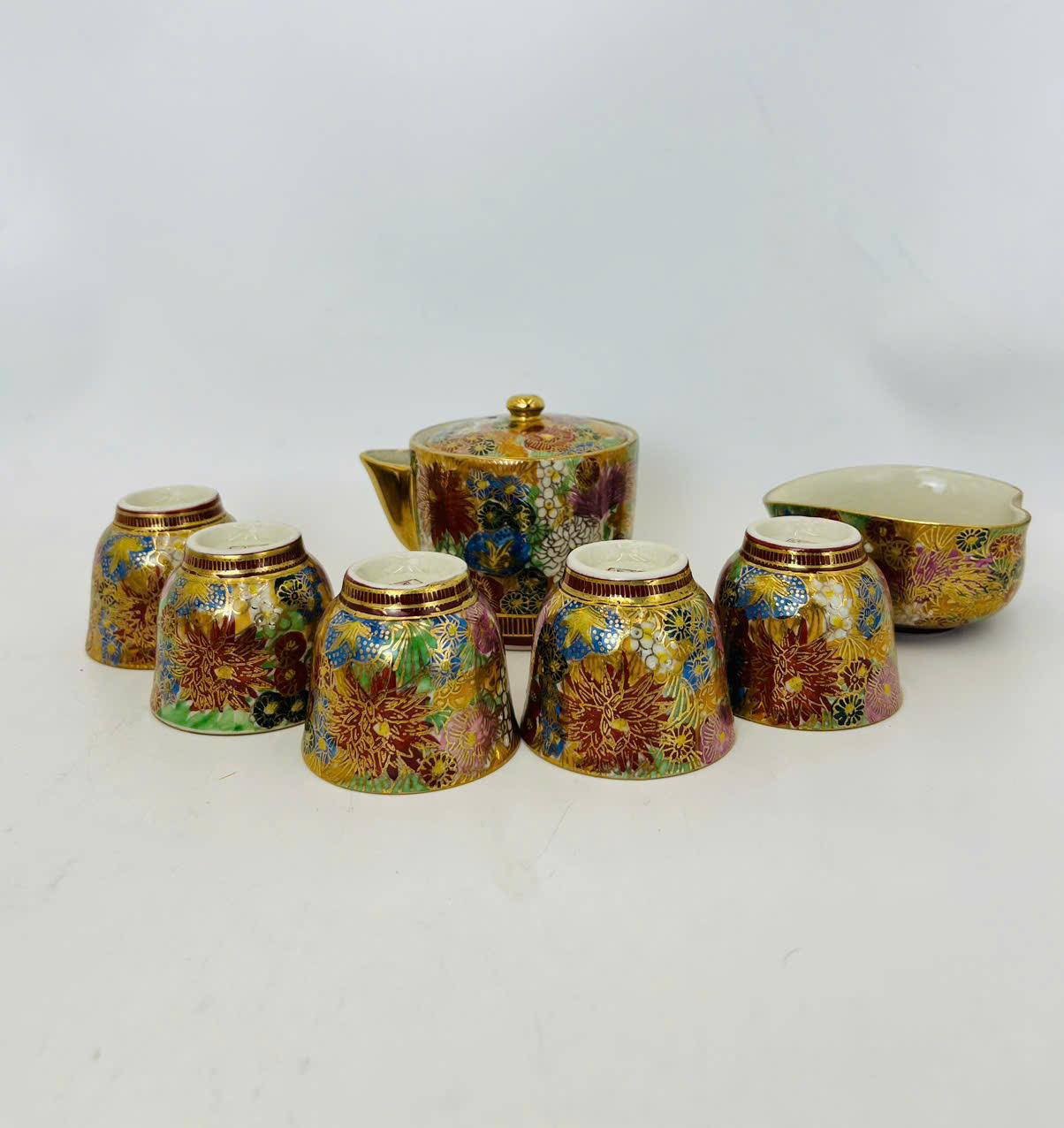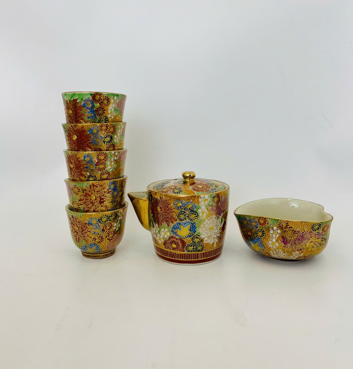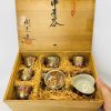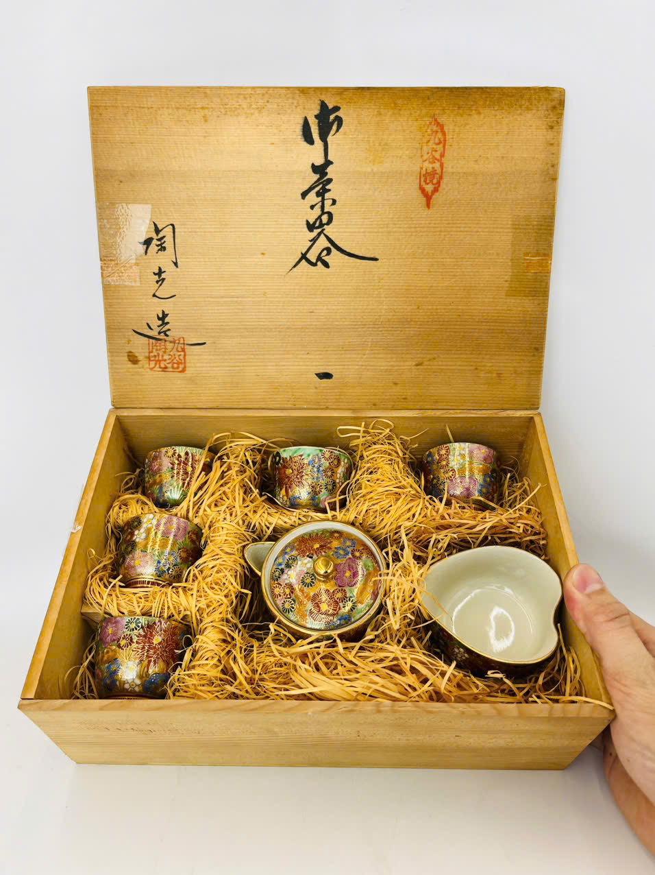 Bộ trà bách hoa gốm Nhật vẽ vàng kutani full hộp gỗ đẹp tinh tế.