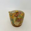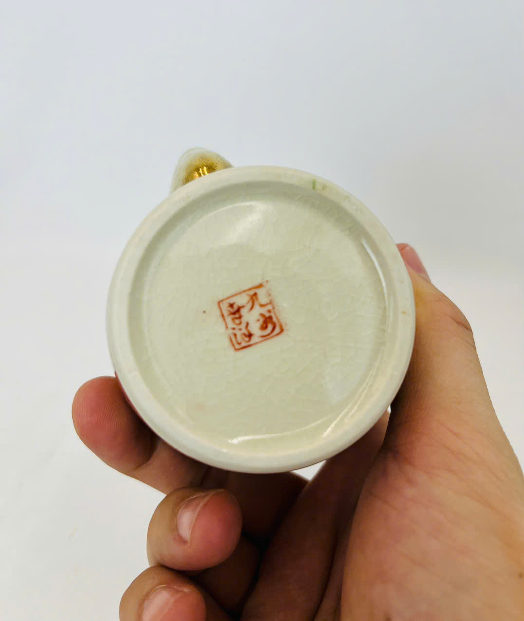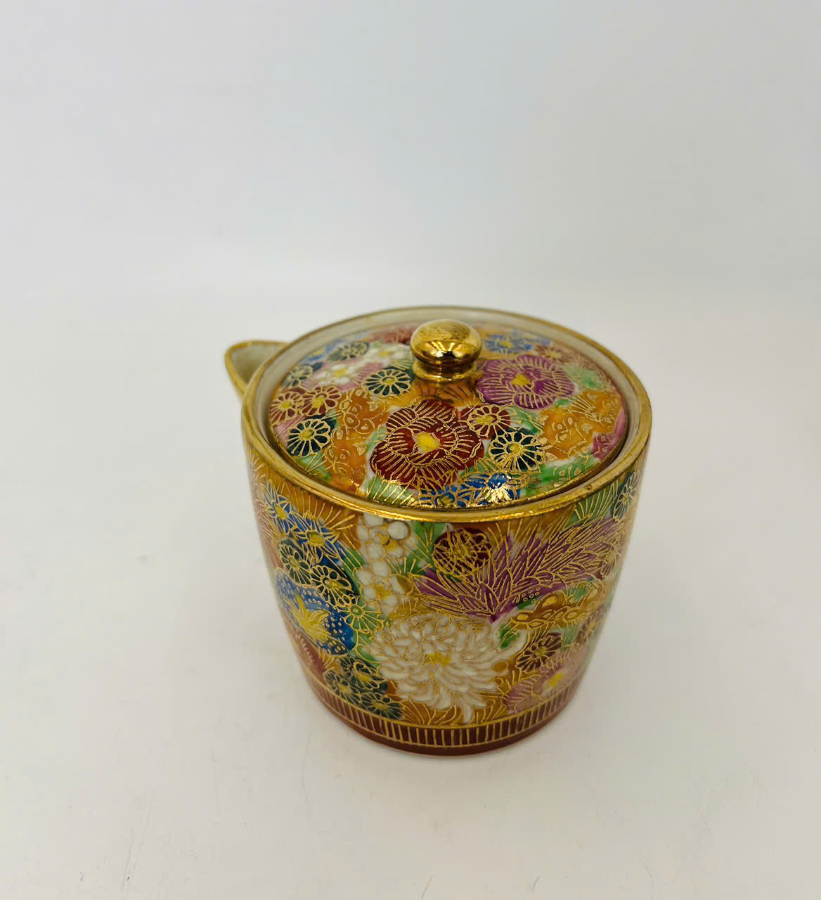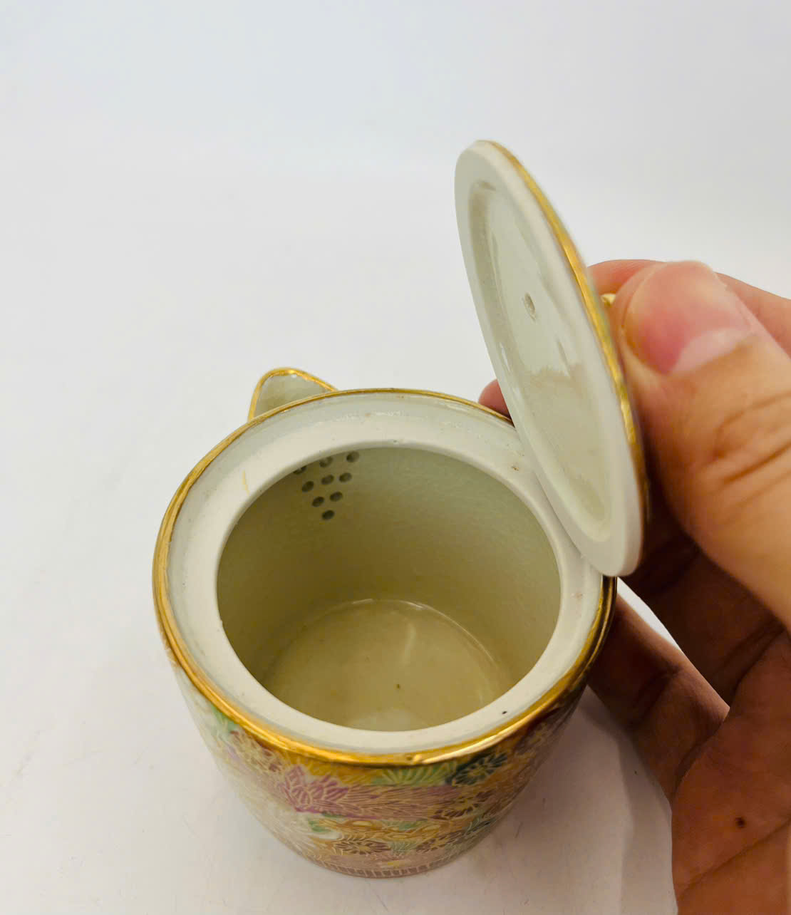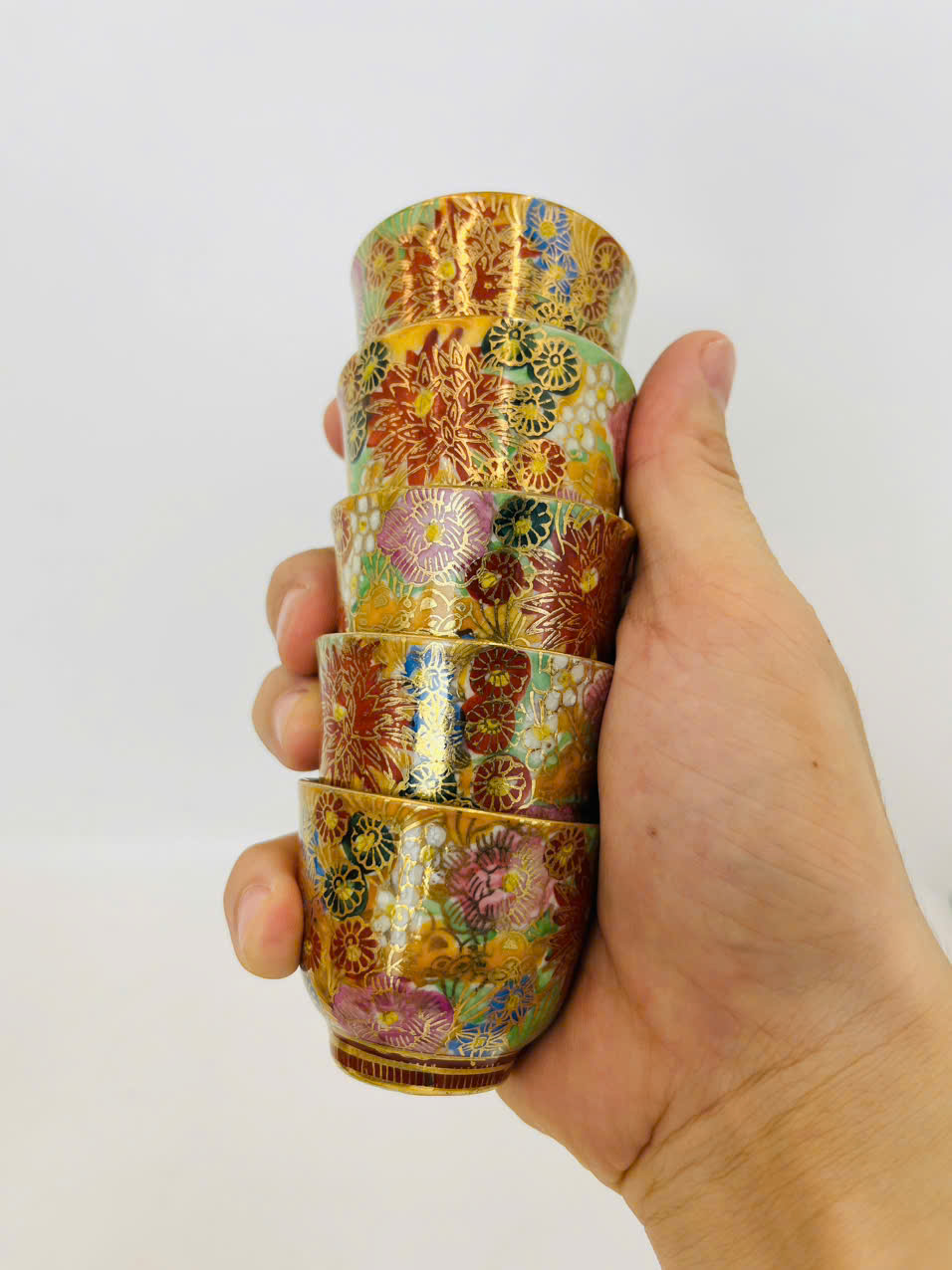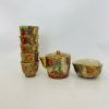 Bộ trà bách hoa gốm Nhật vẽ vàng kutani full hộp gỗ đẹp tinh tế.