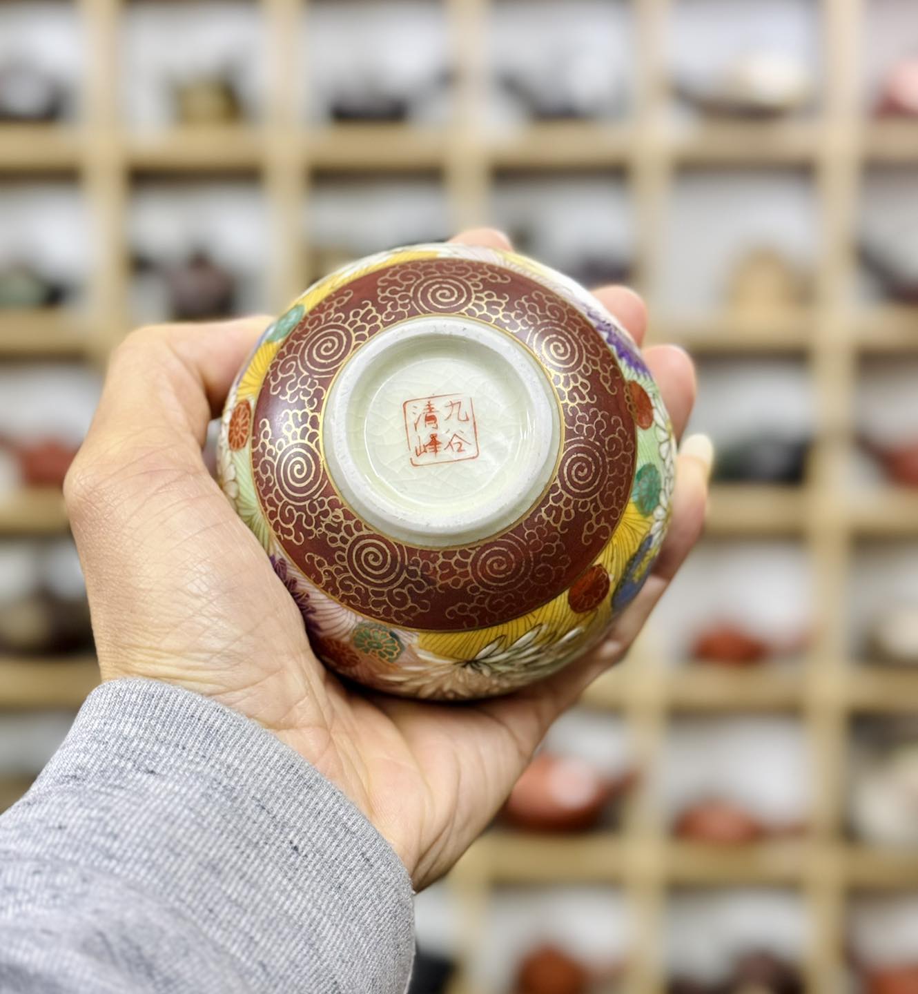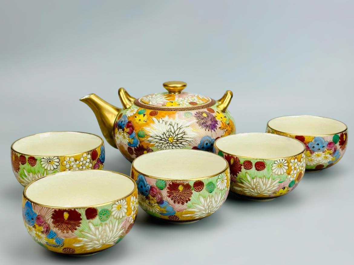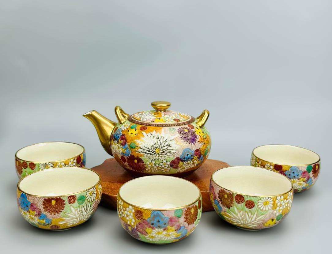 Bộ trà Bách Hoa kutani Nhật Bản dáng quai xách đẹp