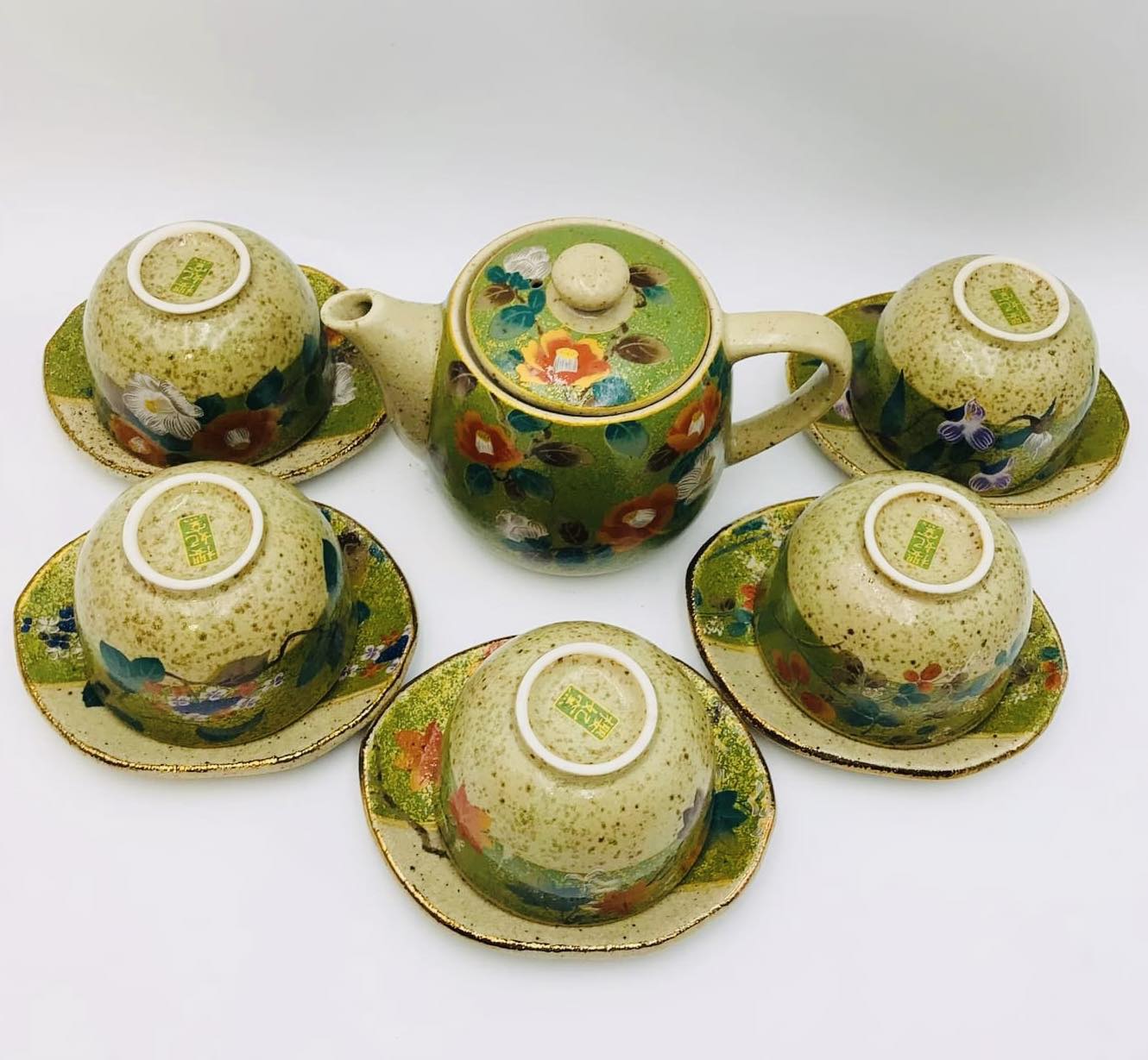 – Hoạ tiết ấm vẽ tay hoa trà rất đẹp + 5 chén và 5 đĩa lót là 5 hoạ tiết khác nhau biểu trưng cho ngũ hành tương sinh