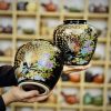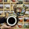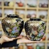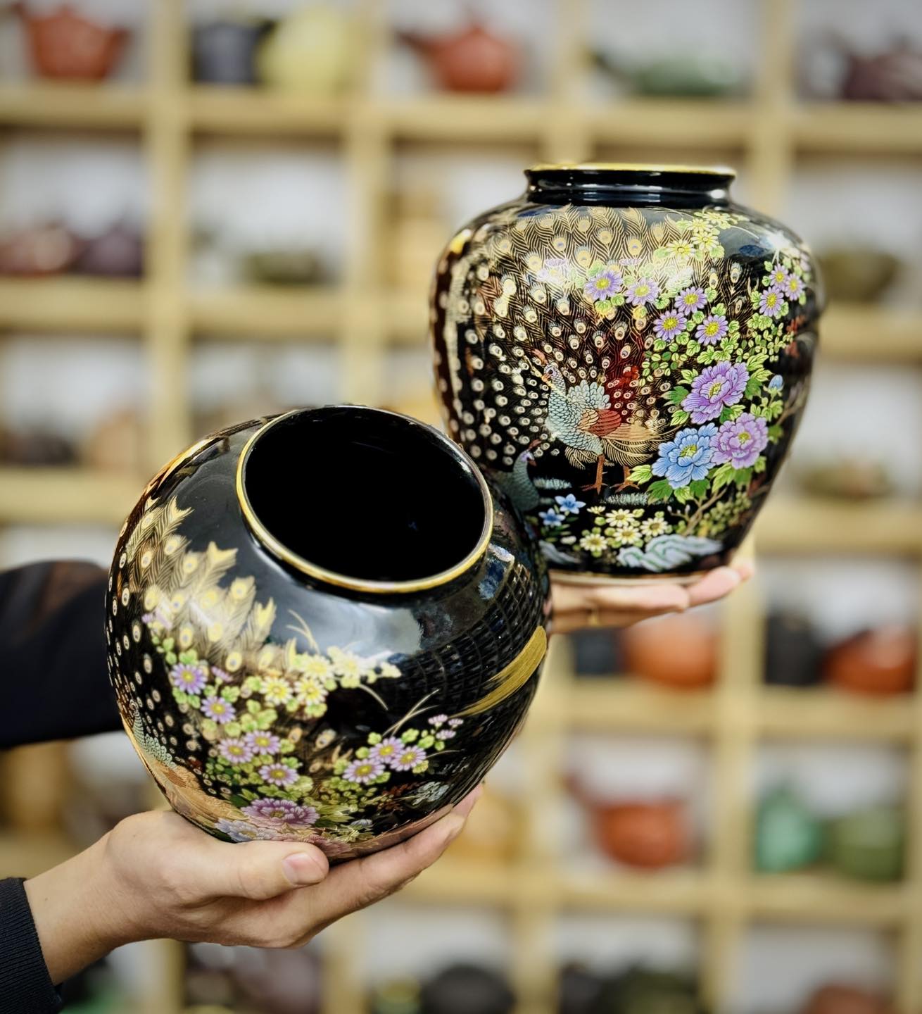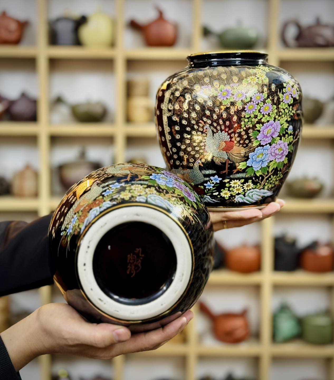 Cặp bình xanh cobalt vẽ vàng tích khổng tước đáo mẫu đơn