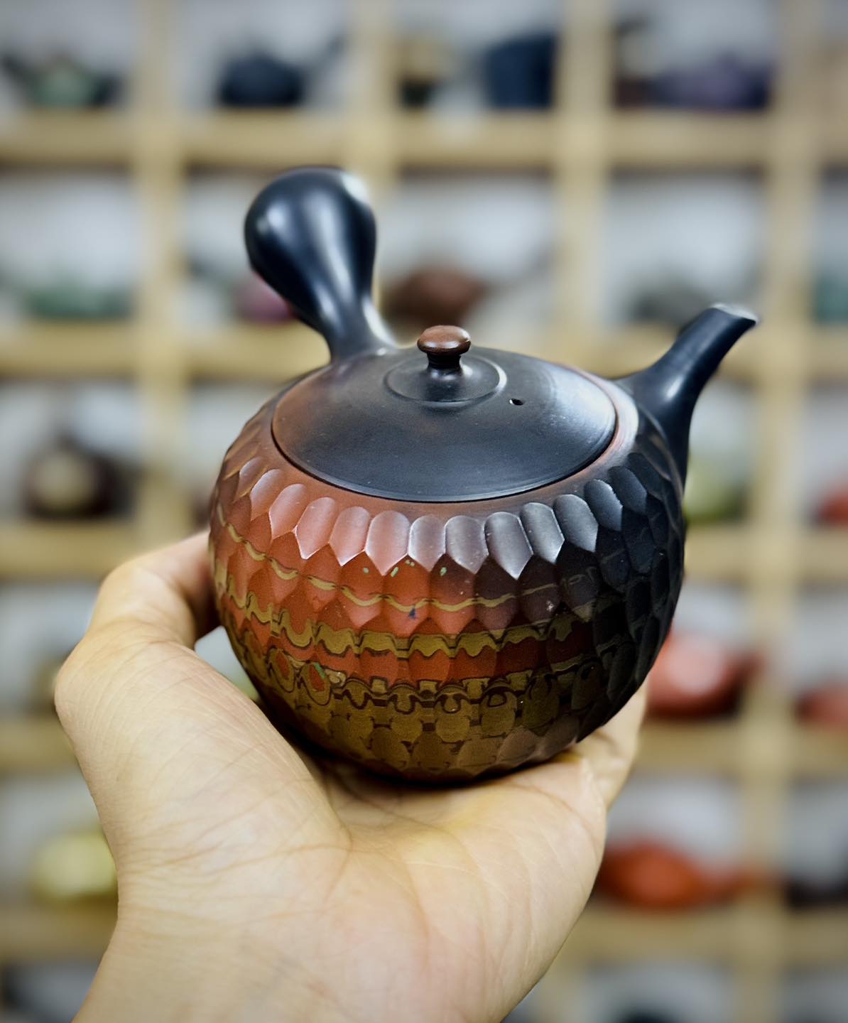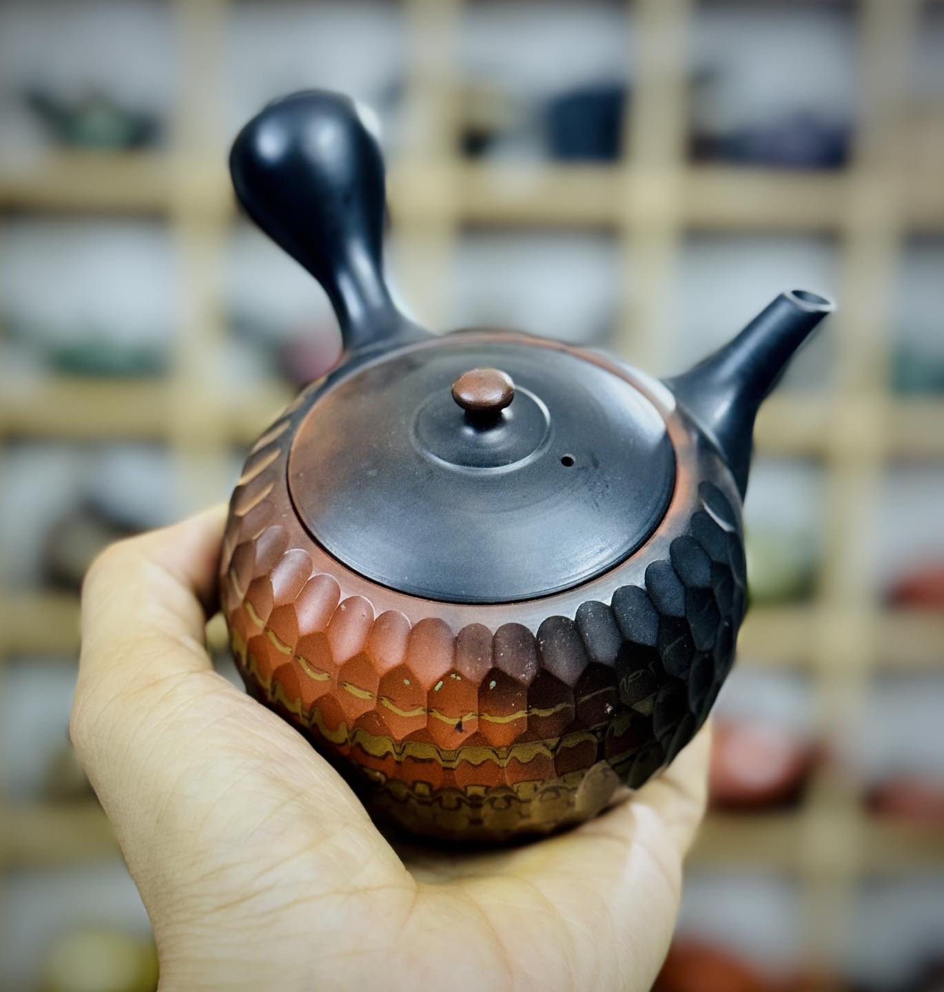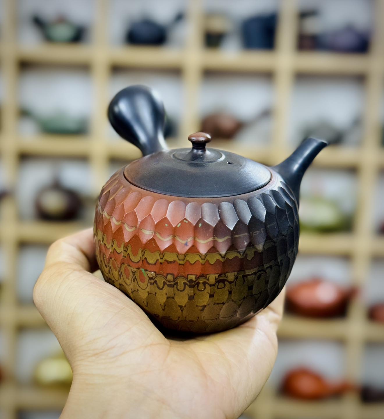 – Ấm trà đất trộn Nerikomi sử dụng ba kỹ thuật tạo tác gồm Nerikomi, yohen hoả biến hai lửa và vát cạnh kim cương