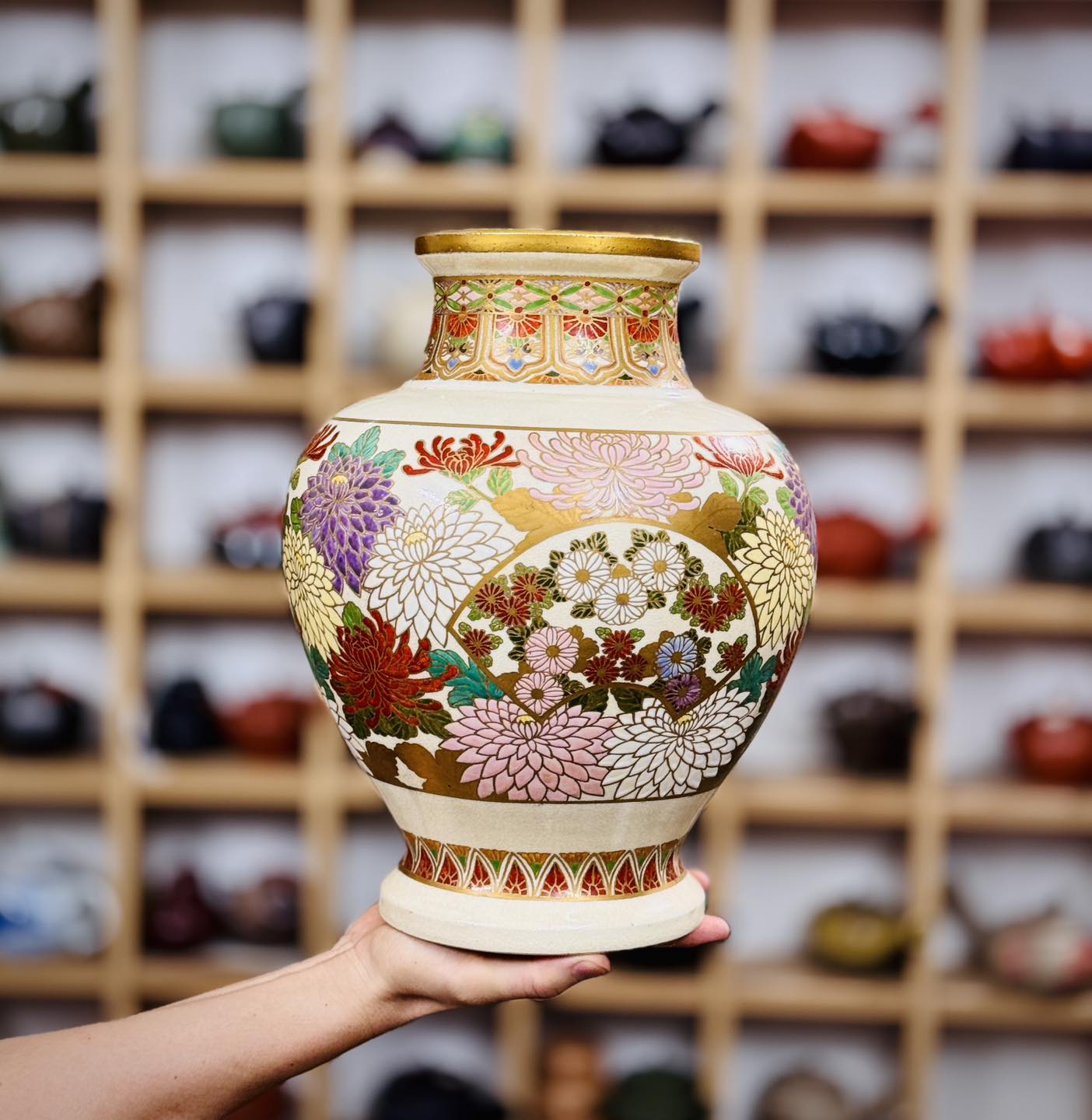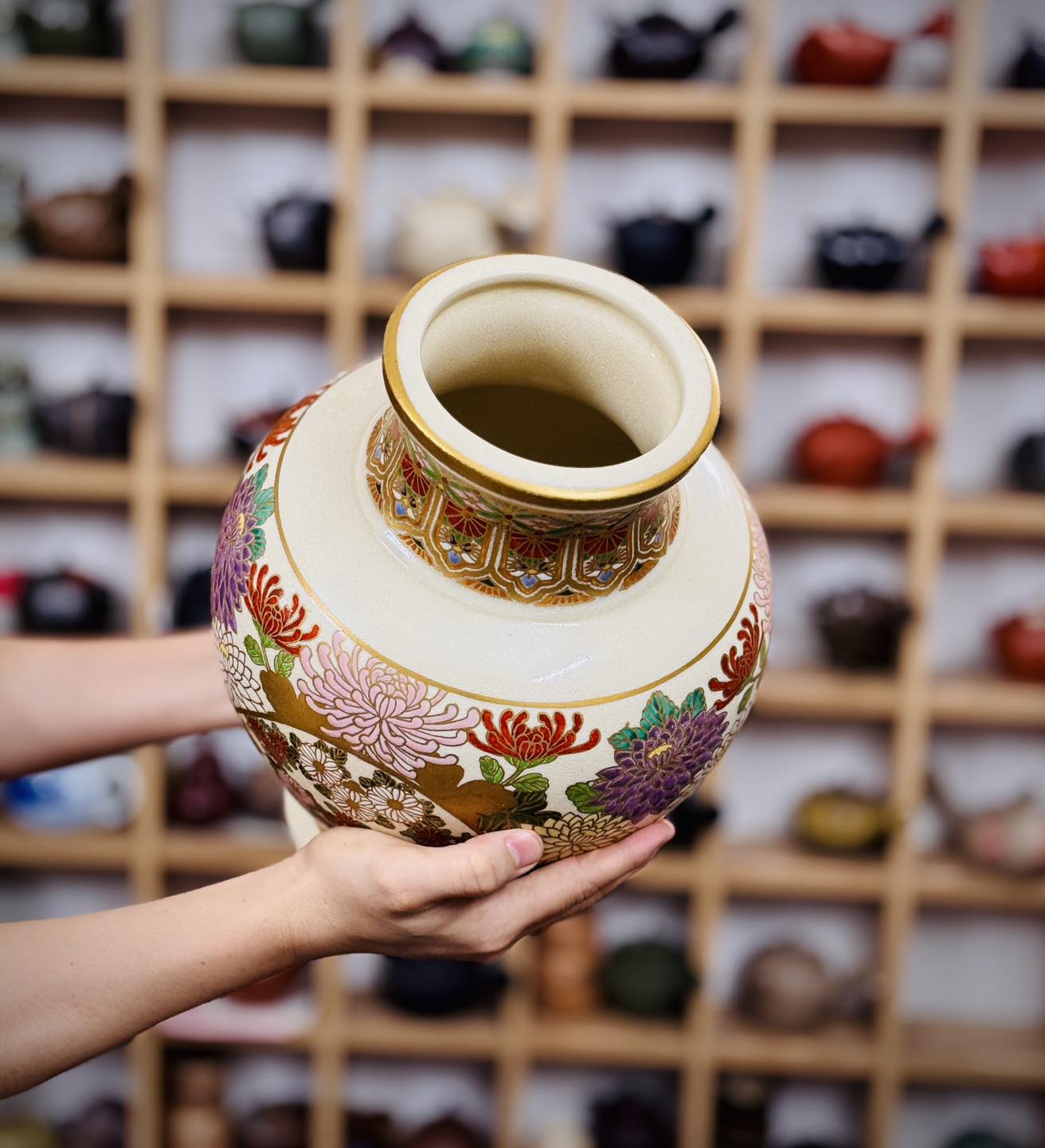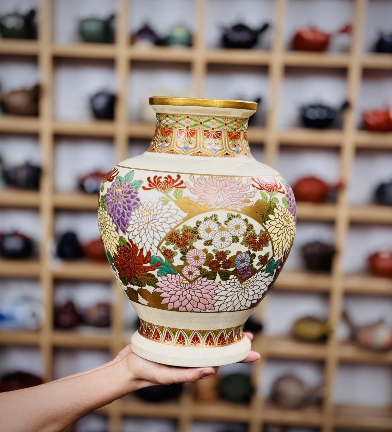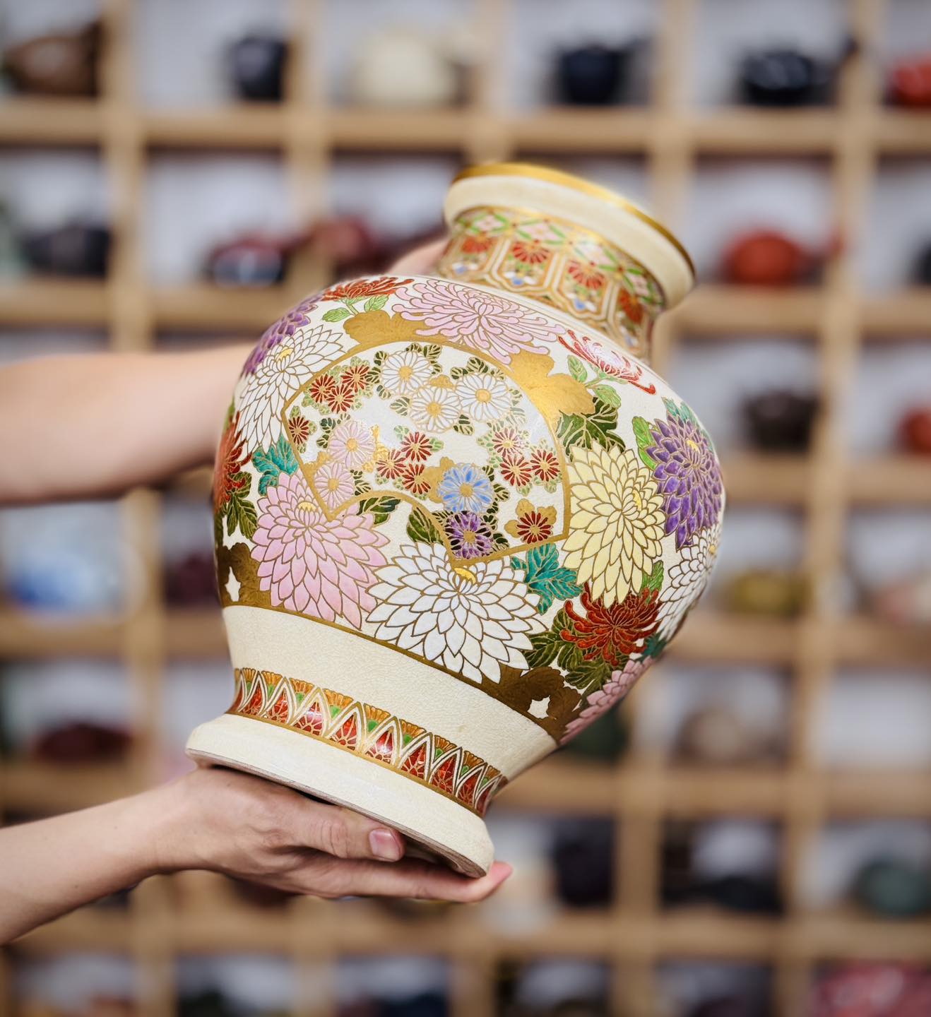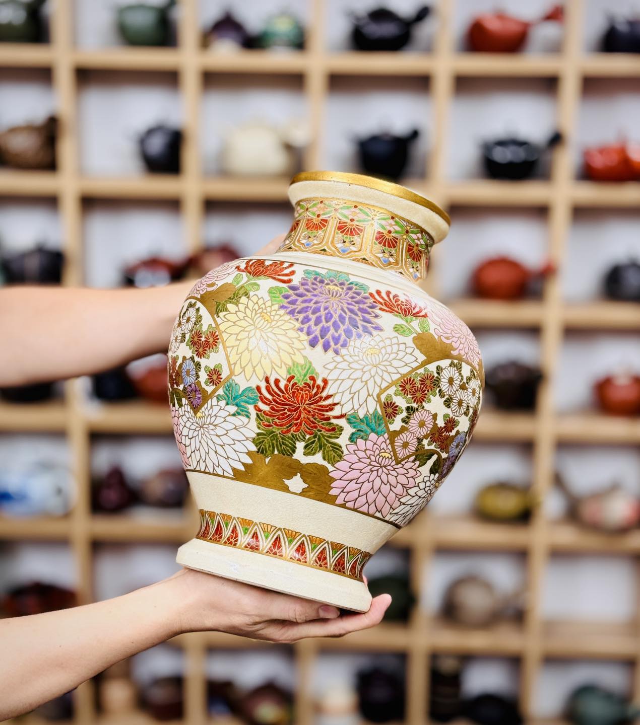 – Hoạ tiết vẽ tay hoa cúc full bình, hoạ tiết vẽ vàng, cốt gốm nặng, size lớn, tình trạng hoàn hảo