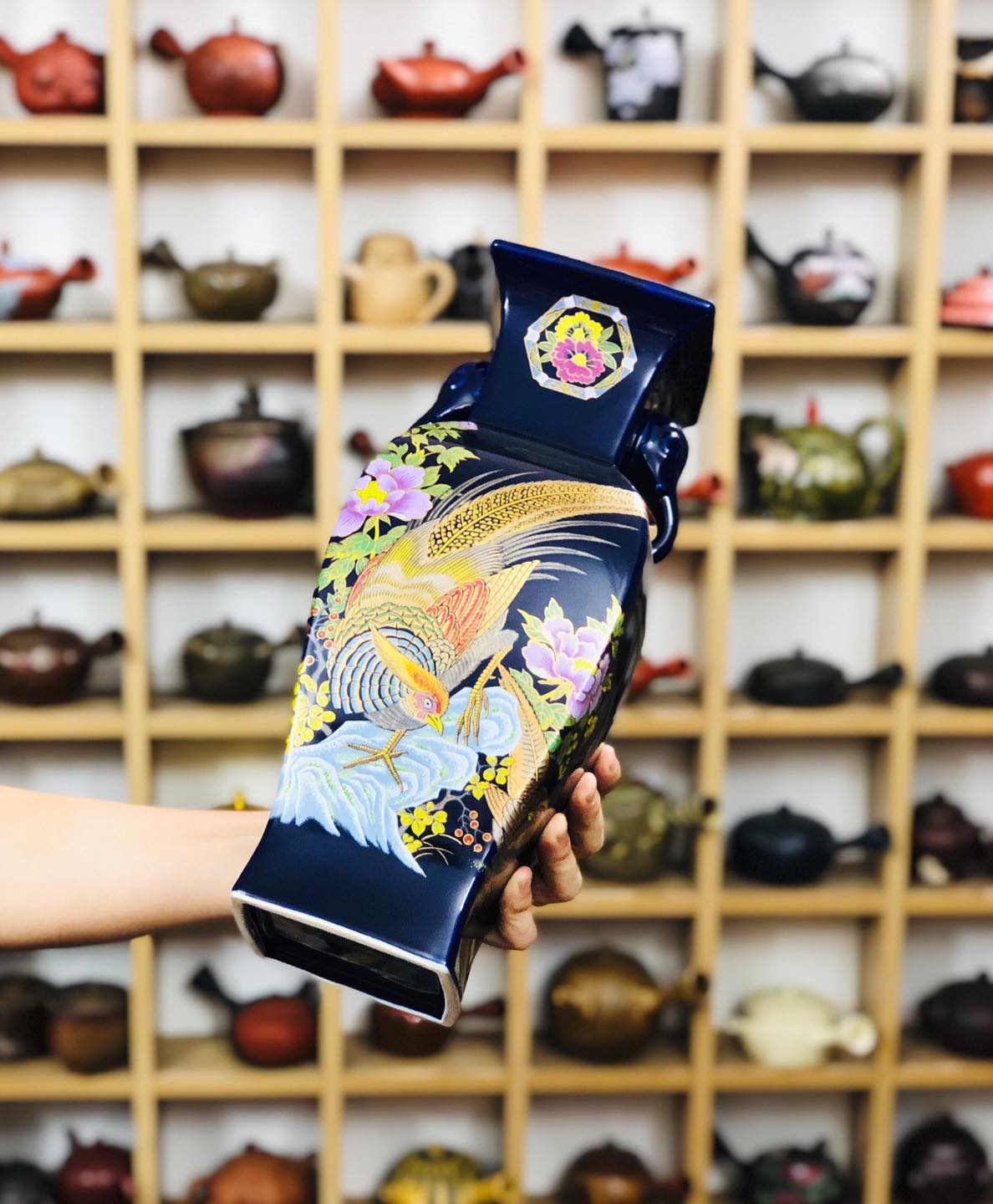 – Bình Chim trĩ Đáo Mẫu Đơn chế tác góc cạnh, 2 bên là linh vật Voi- hoạ tiết vẽ tay vẽ vàng nổi 2 mặt rất tỉ mĩ và nghệ thuật