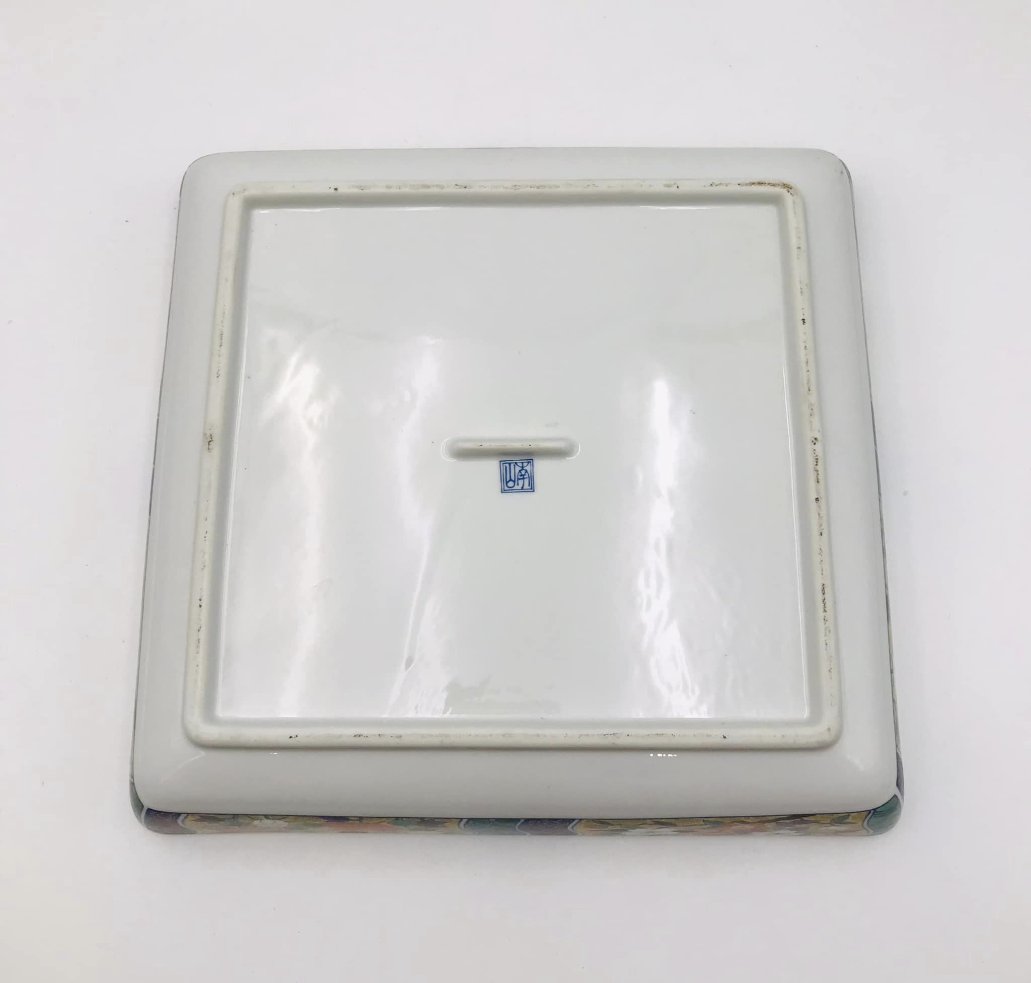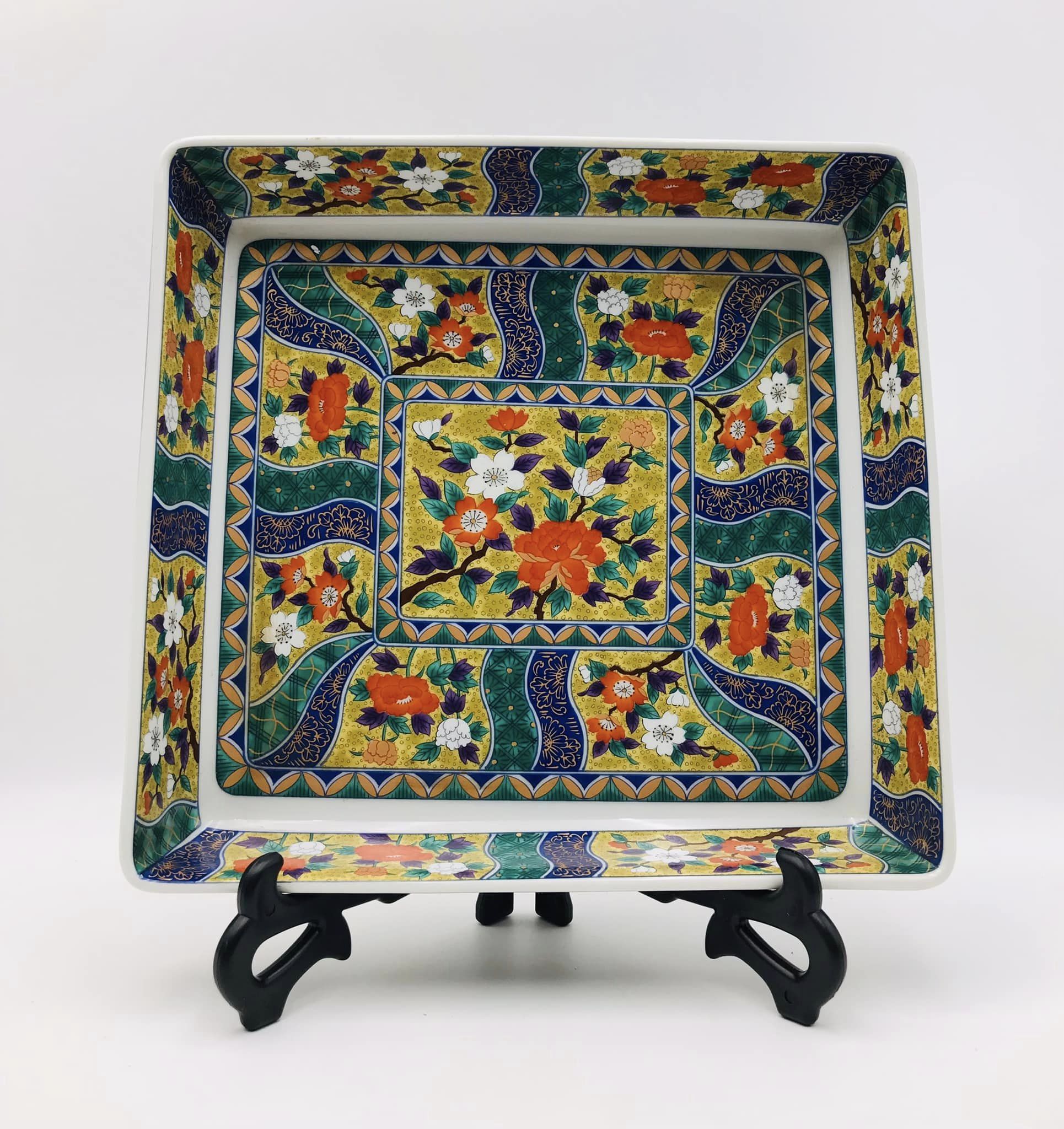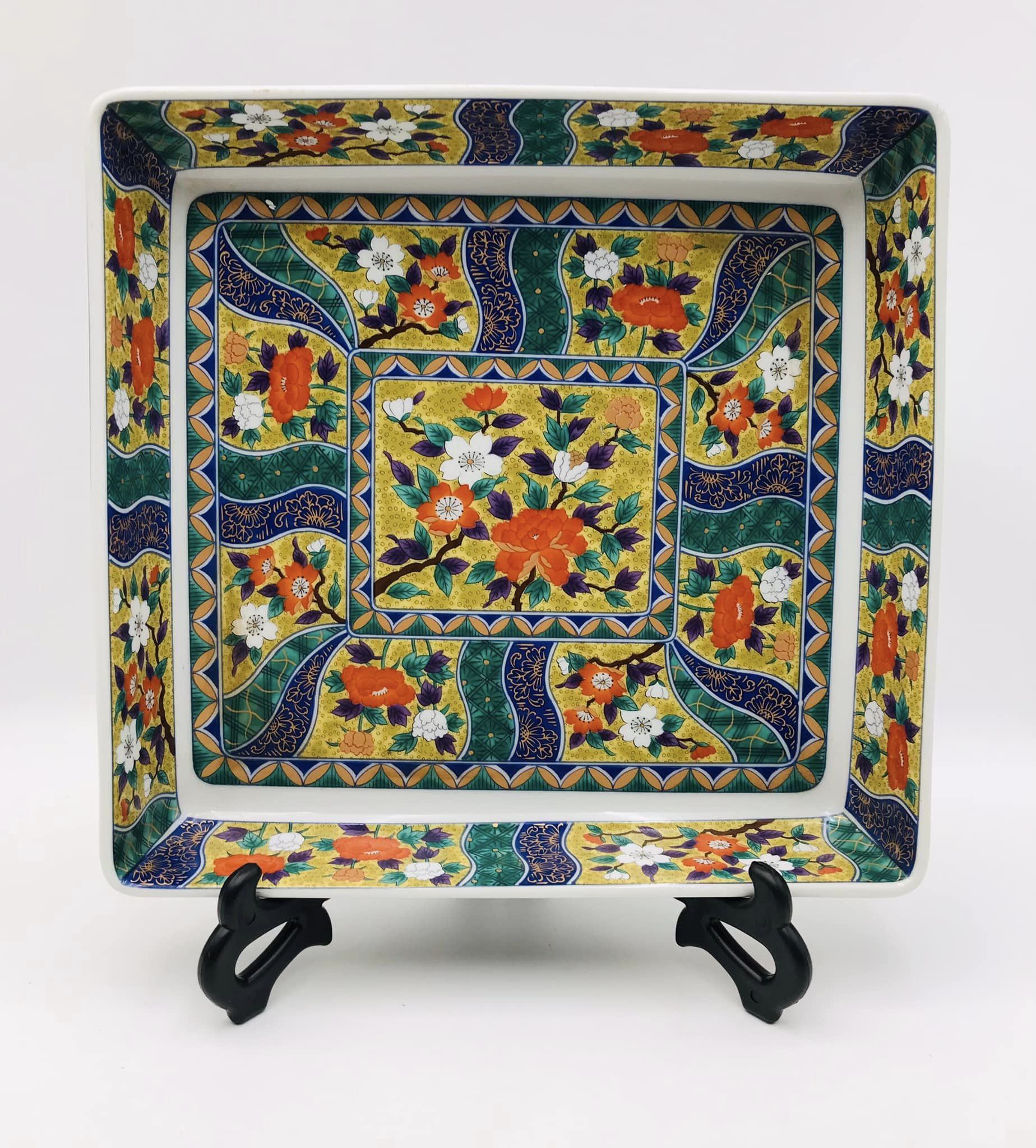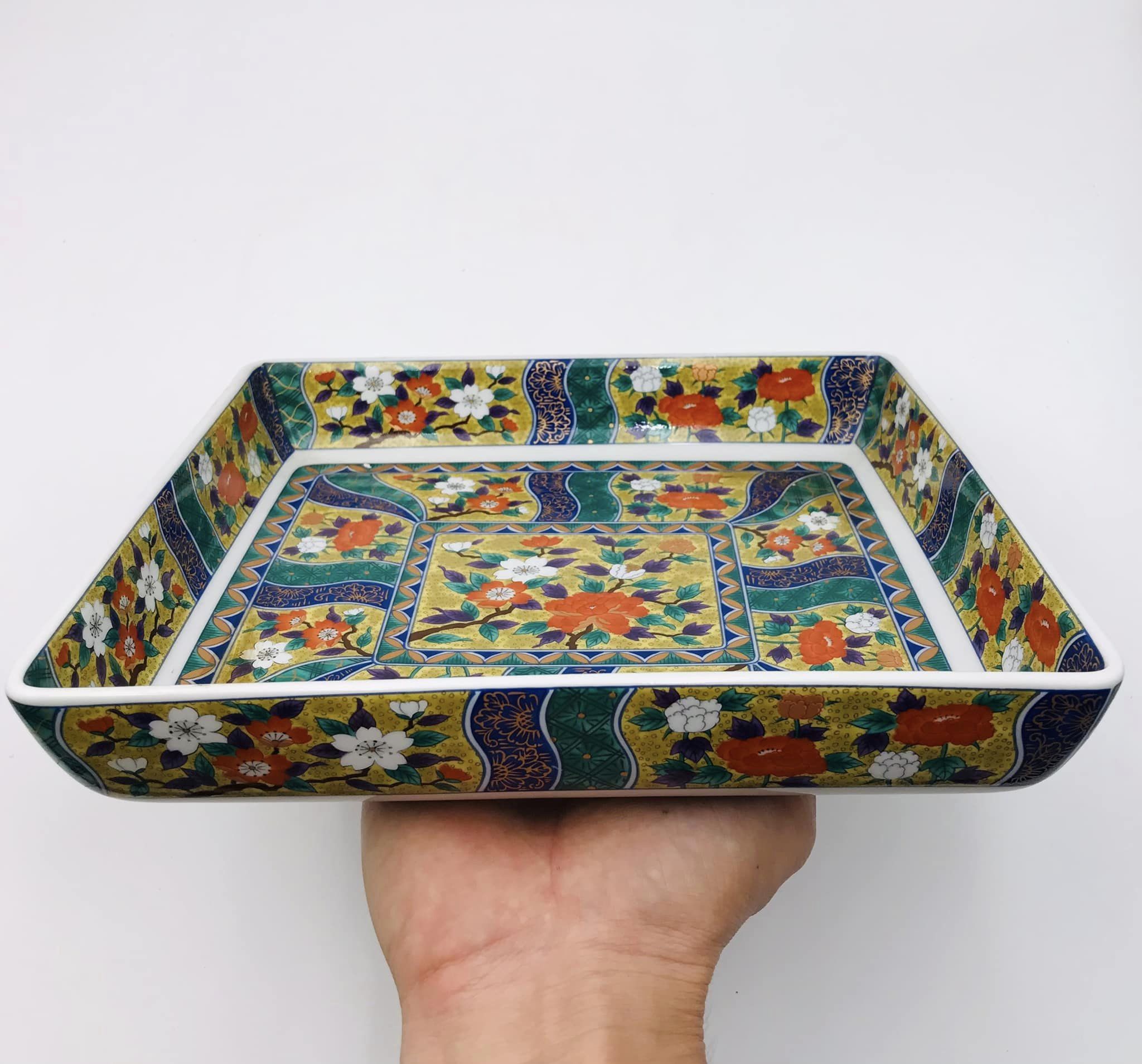 Chiếc khay-đĩa-dầm trà dáng chữ nhật ngũ sắc vẽ vàng thủ công Kutani Nhật Bản