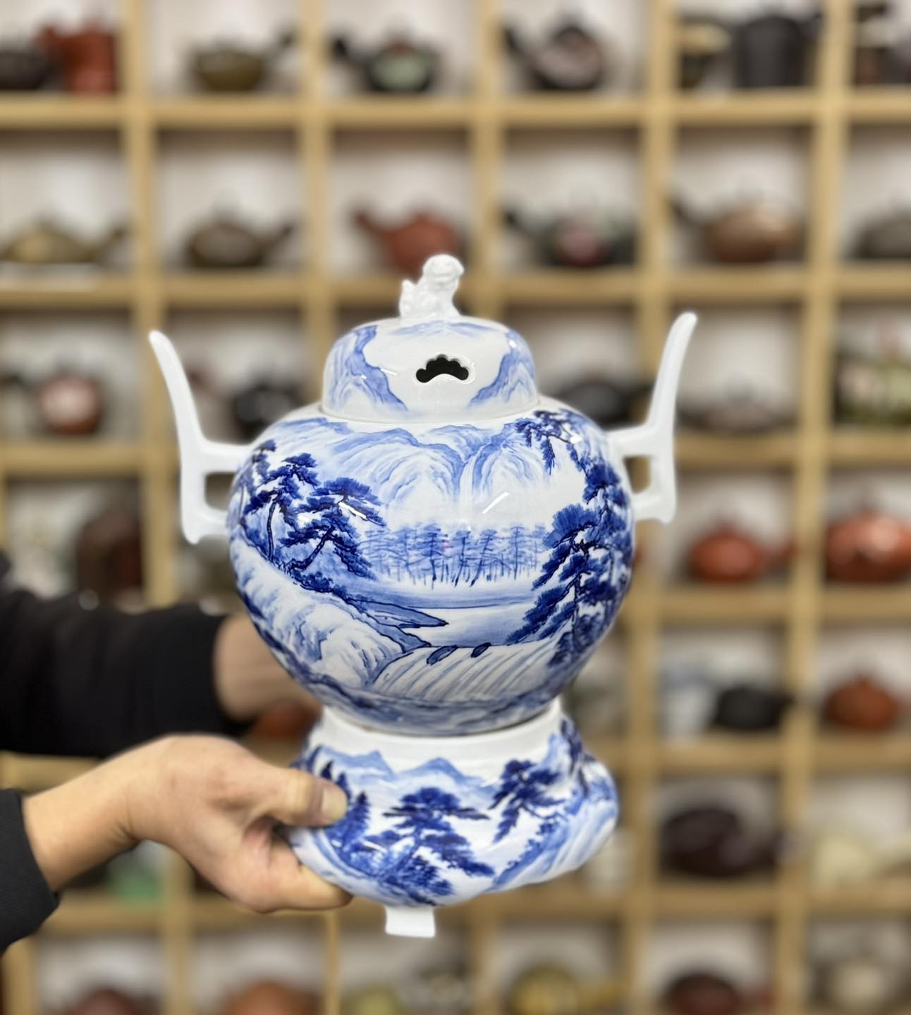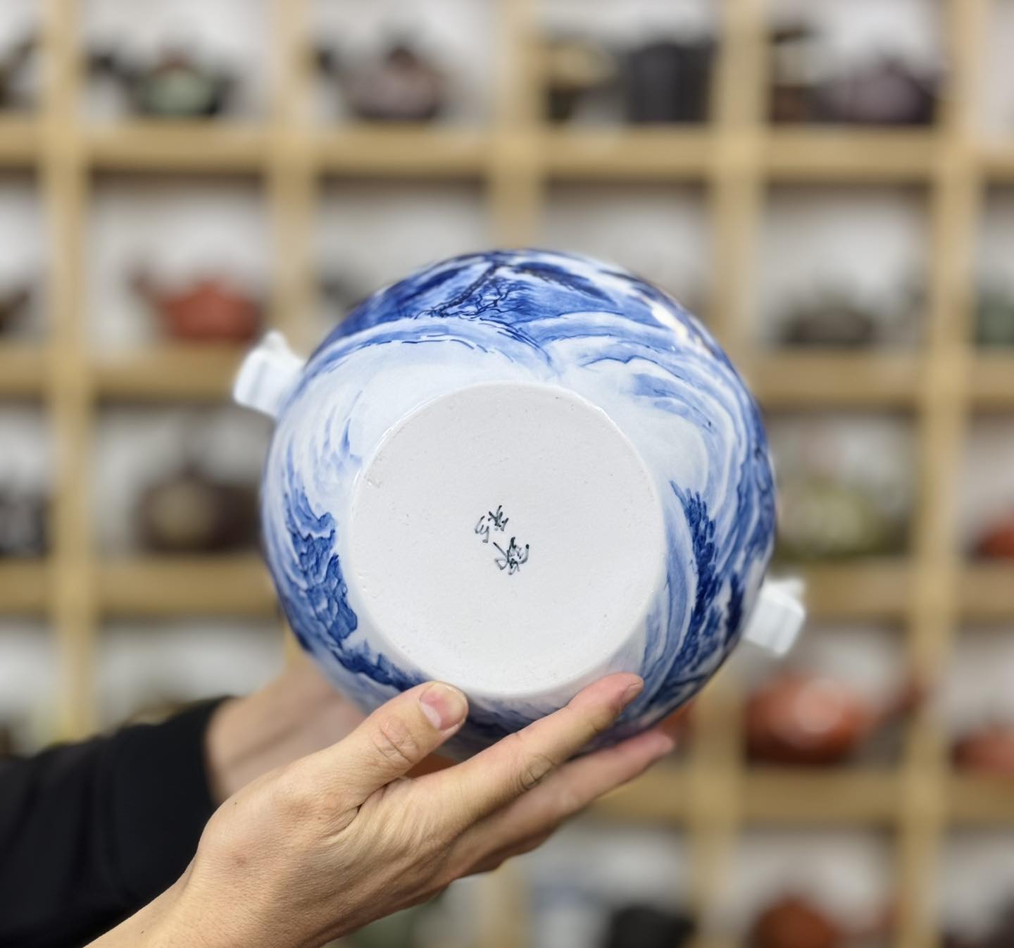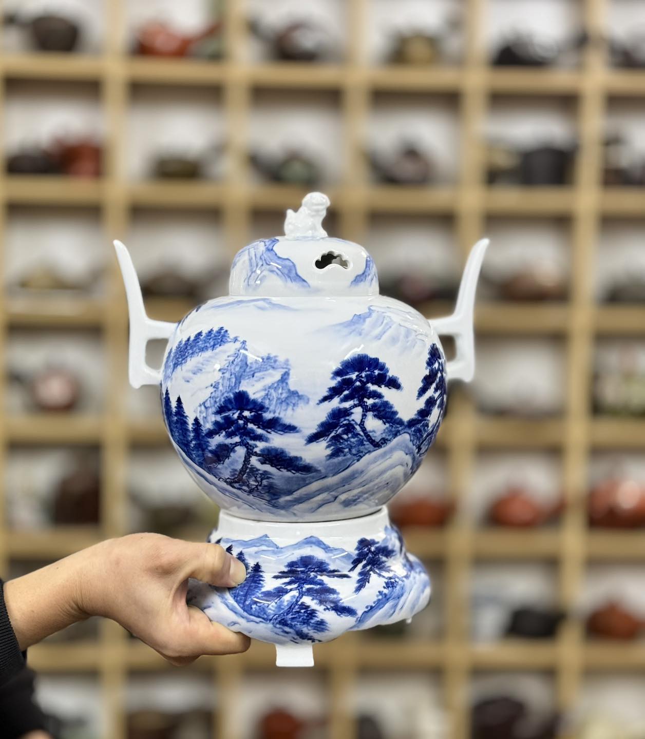 – Hoạ tiết vẽ tay Sơn Thuỷ tứ diện rất đẹp, đỉnh trên là linh vật Kỳ Lân vật phẩm phong thuỷ